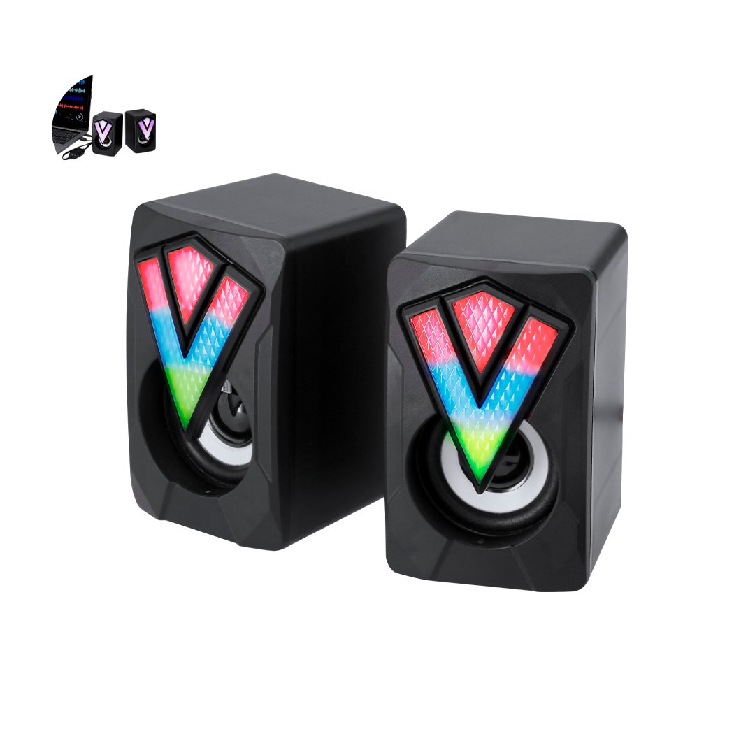 Enceintes gamer conçues pour une expérience de jeu immersive. Conçues avec un boîtier noir mat avec lumières LED multicolores et effets d’éclairage automatiques. Incluent un câble intégré avec régulateur de volume, connexion jack de 3,5 mm et alimentation via USB.
