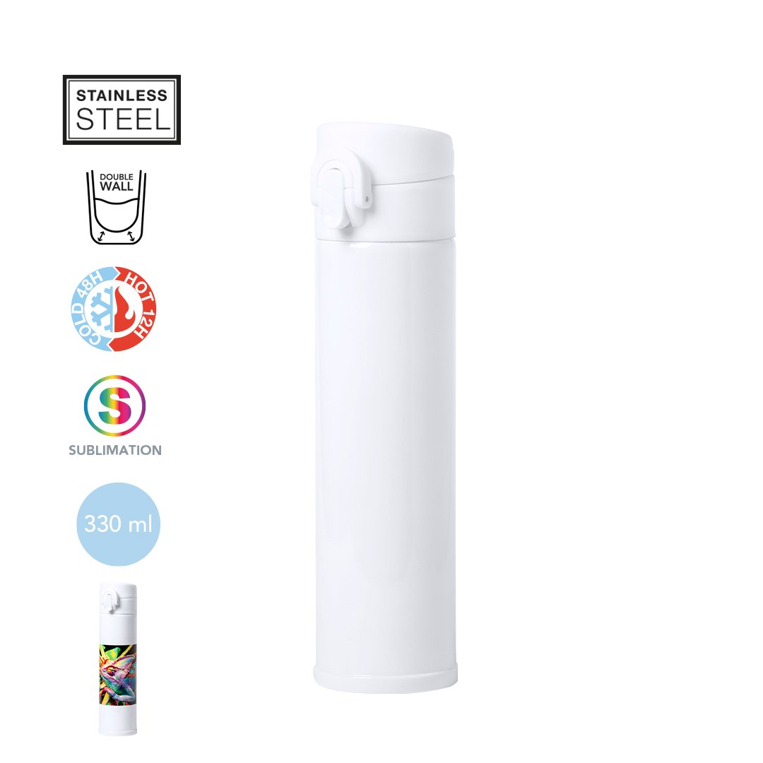 Bouteille isotherme 330 ml en acier inoxydable. Double paroi pour une meilleure et plus longue conservation de la température des liquides, avec verrouillage de sécurité et comprenant un mécanisme d’ouverture facile par bouton. Spécialement fabriqué pour l’impression par sublimation et présenté dans une boîte design.Manuel d’instructions disponible en espagnol et en anglais.