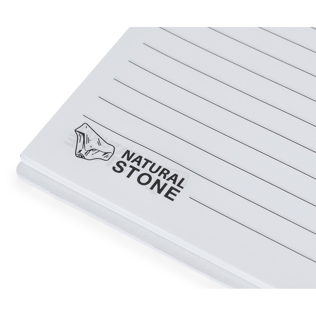 Ensemble carnet et stylo. Contenu:Cahier à anneaux avec couvertures rigides en extraits de pierre dans une élégante finition blanche et porte-stylo. Couverture au design unique avec relief en relief. Avec 70 feuilles de couleur blanche et disposées en une bande, avec le caractère distinctif de la pierre naturelle.Stylo à bille Nature Line avec mécanisme à bouton-poussoir. Corps découpé à l’emporte-pièce à base d’extraits de pierre naturelle, contribuant à réduire l’utilisation de plastiques, tout en offrant une finition lisse et résistante. En blanc et avec le logo Natural Stone sur la partie supérieure. Cartouche Jumbo et encre bleue.Le matériau utilisé dans la préparation du cahier est 100% recyclable et sans chlore, avec des propriétés imperméables, hautement résistantes et lavables, devenant ainsi une alternative écologique et durable au papier conventionnel, dont l’origine n’est pas traditionnelle et ne provient pas d’arbres.Présenté dans un sac recyclé individuel