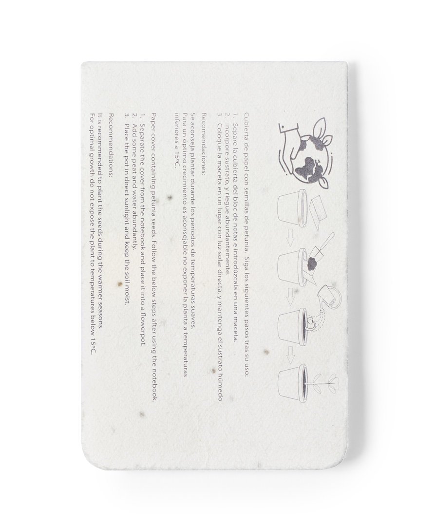 Bloc-notes de la ligne nature, avec des couvertures en papier graine, recyclable et dégradable. Comprend des graines de pétunia sur les deux couvertures, ce qui en fait du papier plantable à la fin de sa durée de vie utile. Intérieur avec 10 notes autocollantes moyennes et 30 mini notes autocollantes de différentes couleurs. Fleurs aux couleurs assorties, avec instructions de plantation au dos de la couverture et présentées dans un sac individuel en papier recyclé.