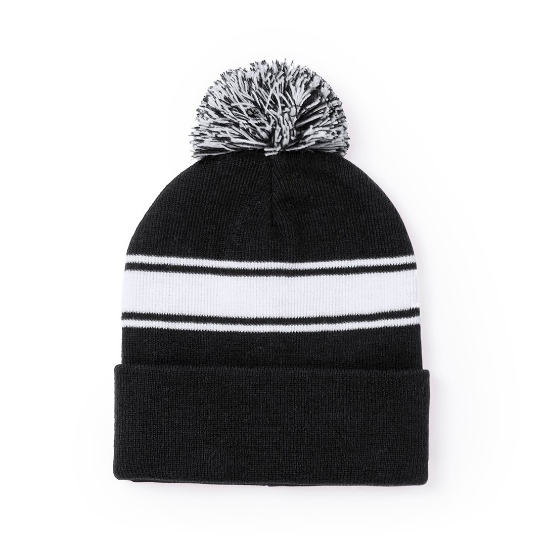 Bonnet en acrylique doux et chaud en coloris variés. Design original, avec bande frontale blanche et pompon bicolore assorti.