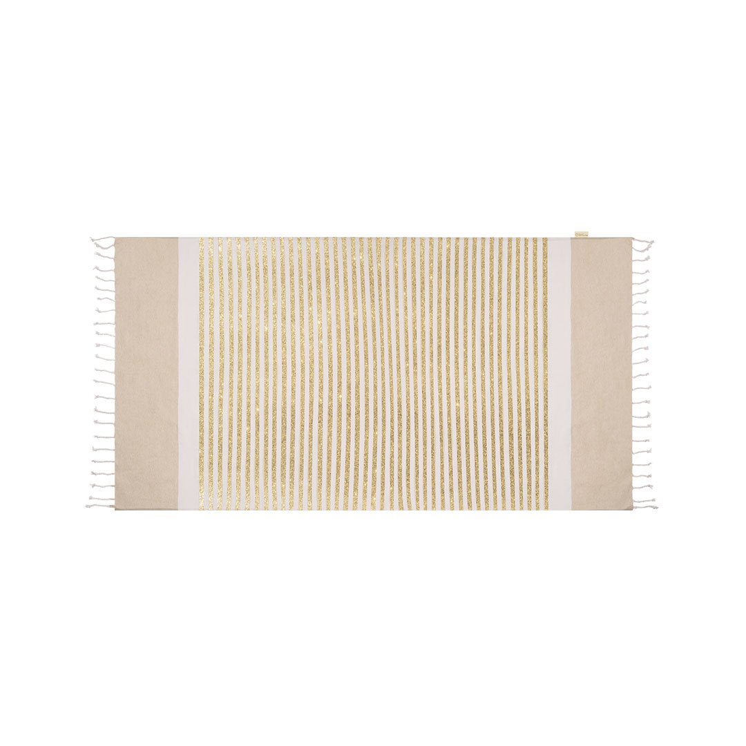 Pareo serviette en coton recyclé de 180g/m2. Design à rayures blanches en combinaison avec des rayures dorées effet paillettes, extrémités en beige lisse et magnifiques franges aux extrémités en forme de cordon. Inclut une étiquette avec le label de coton recyclé.