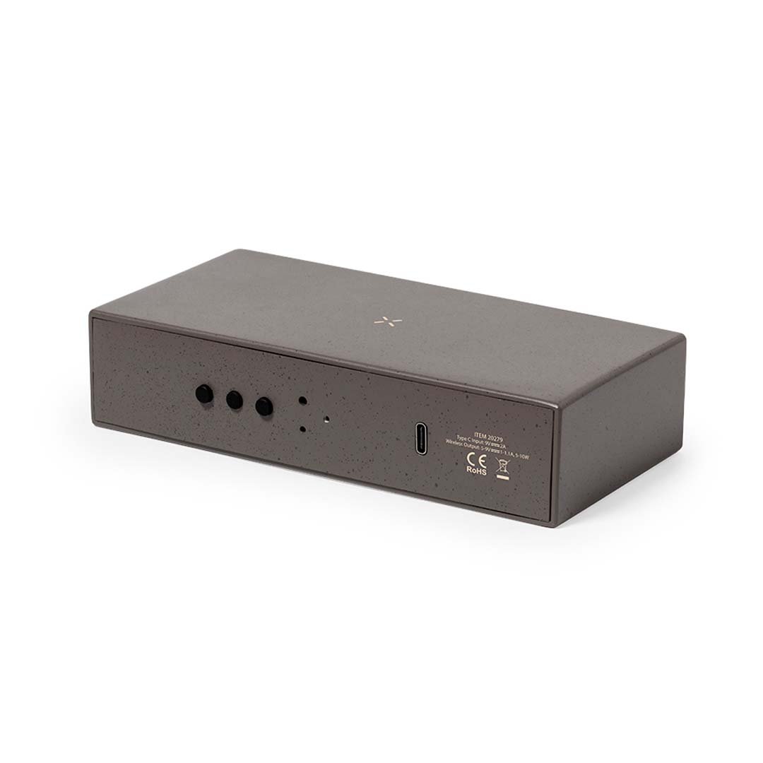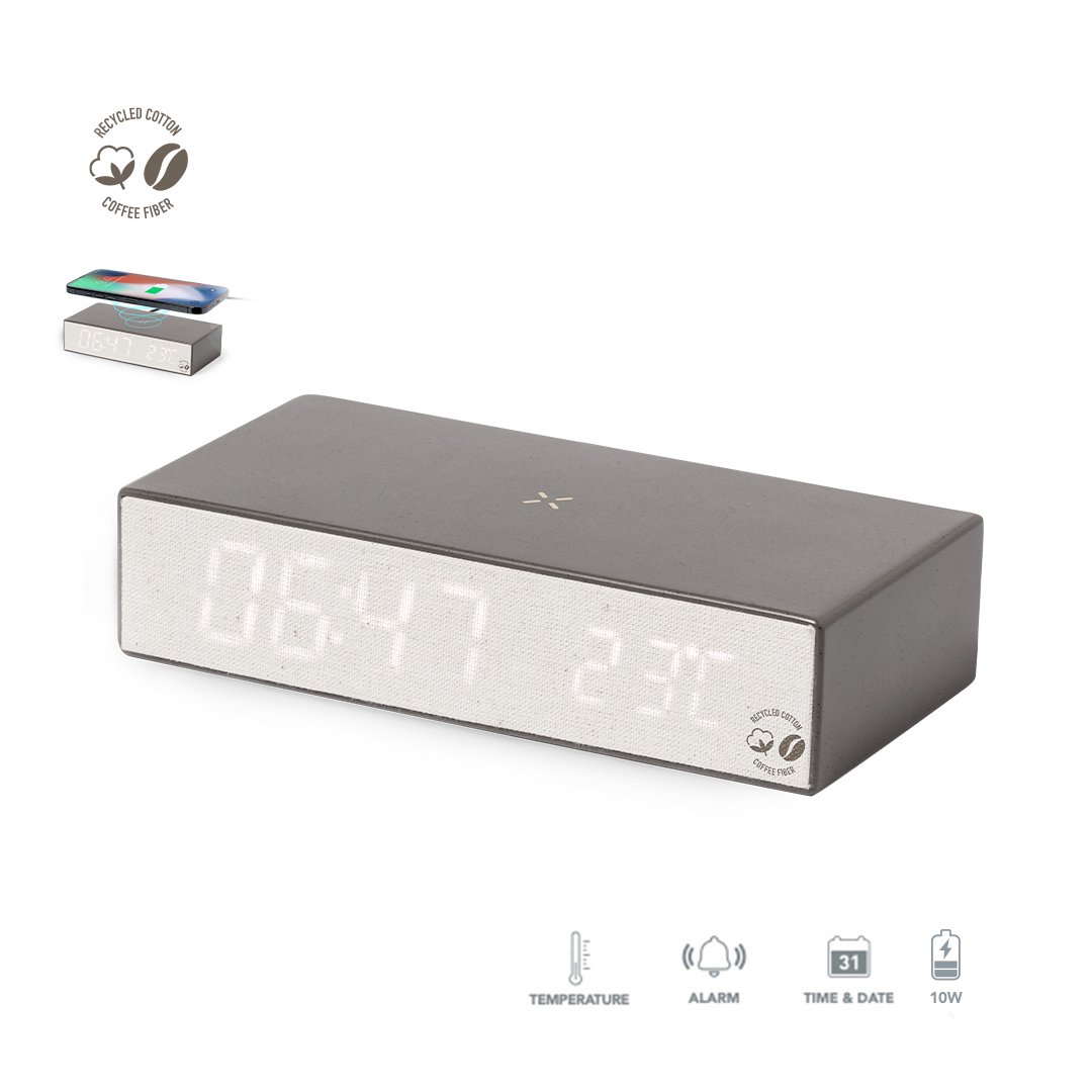 Montre multifonction avec chargeur sans fil 10W intégré. Fabriqué en fibre de café et coton recyclé. Fonction heure (12/24h), alarme, avec intensité lumineuse réglable. Alimenté par connexion USB. Compatible avec les appareils équipés de la technologie de charge sans fil et présenté dans une jolie boîte au design kraft. Avec fibre de café distinctive et coton recyclé. Comprend un manuel d’instructions en espagnol et en anglais.La fibre de café est une solution circulaire obtenue à partir de l’utilisation des déchets produits lors de l’obtention du café. Une alternative durable qui favorise la réduction de l’utilisation des plastiques, économise de l’énergie dans son processus de fabrication et contribue à la protection de l’environnement.Certification GRS disponible (Global Recycled Standard / Global Recycling Standard), qui garantit l’origine recyclée du matériau utilisé pour fabriquer le produit.