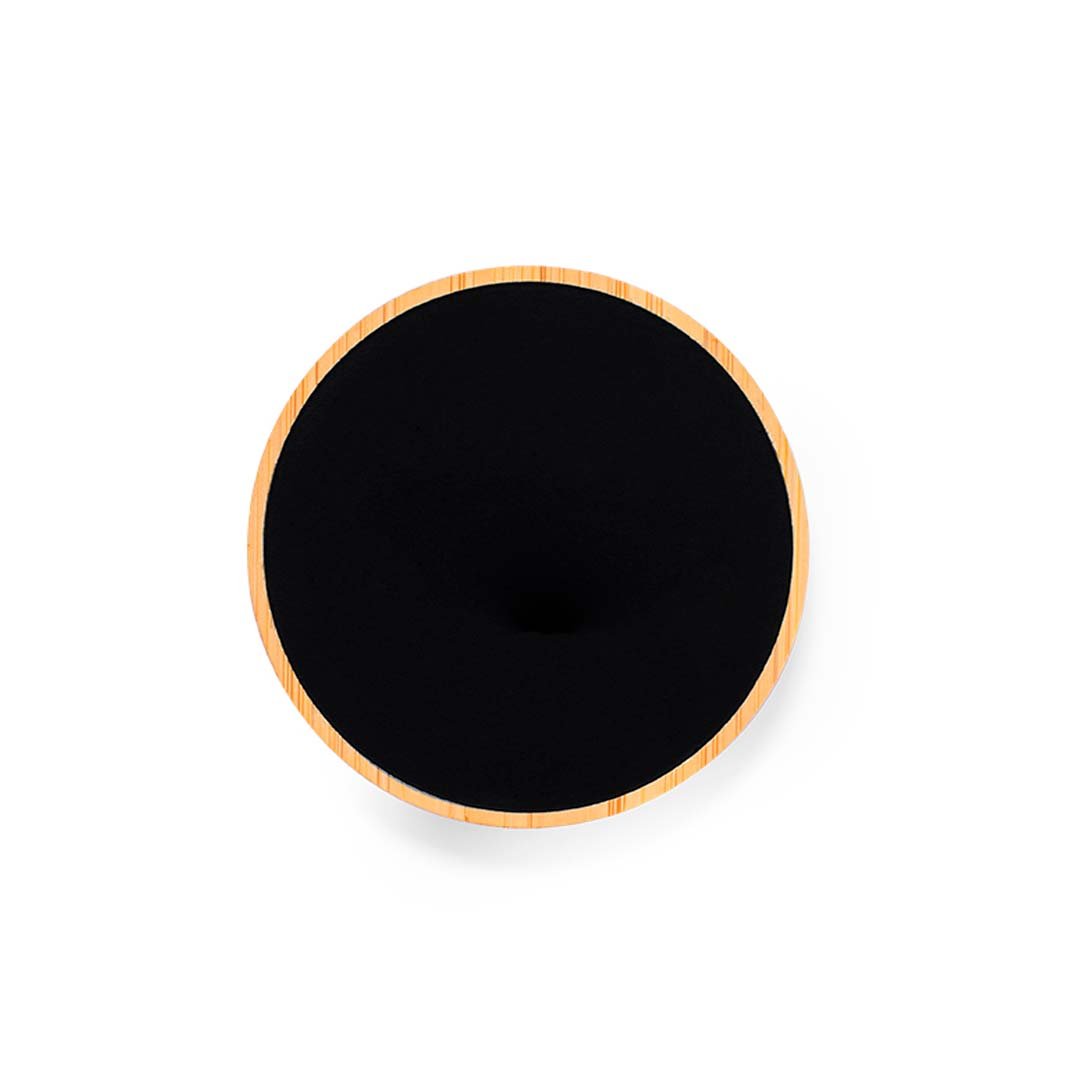 Chargeur sans fil circulaire. Fabriqué en bambou, avec une élégante surface noire. Lumière led intérieure et revêtement extérieur spécialement conçu pour le marquage laser, illuminant ainsi le logo. Avec fonction de charge 15W, compatible avec les appareils équipés de la technologie de charge sans fil Qi. Avec une base antidérapante, il comprend un câble de chargeur de type C et un manuel d’instructions en espagnol et en anglais. Présenté dans une boîte design kraft individuelle.
