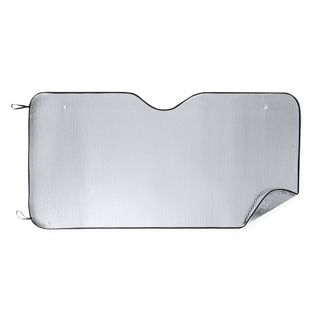 Pare-soleil en aluminium avec bulles sur les deux côtés en coloris argent métallisé et liseré noir. Grande taille de 180 x 90cm, avec anneaux de renfort en métal, sangles élastiques pour le pliage et deux ventouses pour la fixation. Livré à plat pour faciliter l´impression.