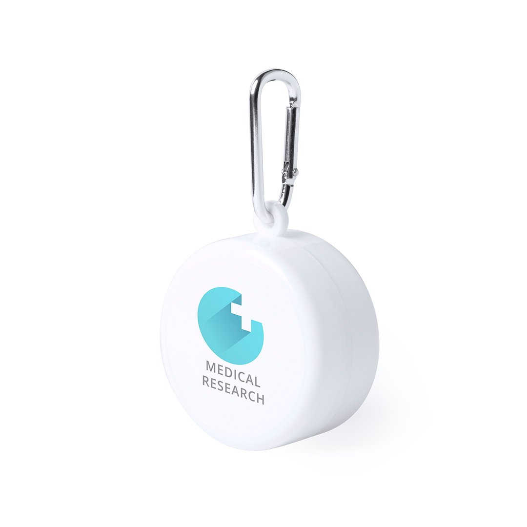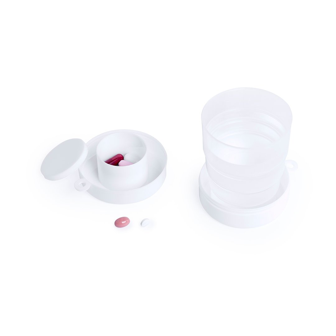 2 en 1 Pilulier et Verre pliable. Sans BPA. Pilulier Ø 3,5 x 2,7 cm. Verre de 220 ml. Couvercle à fermeture pression. Sur mousqueton en aluminium. Ne passe pas au lave-vaisselle et au micro-ondes.
