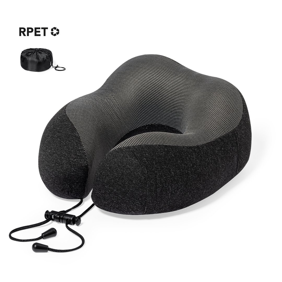 Coussin portable confortable rembourré pour cou. Expérience de confort maximale pour tout voyage grâce au coussin doux et aux fermetures de cordon pour un ajustement correct et confortable. Avec étui en RPET pour le protéger dans le transport et étiquette distinctive. Le matériau RPET est fabriqué à partir de plastique recyclé, ce qui encourage la réutilisation des déchets plastiques et contribue à la durabilité de la planète.