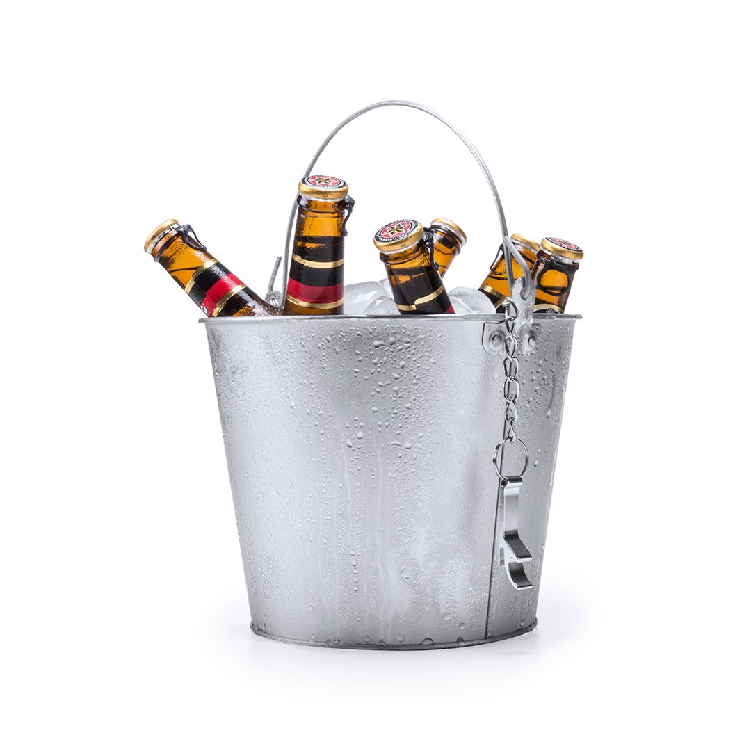 Seau métallique à anse d´une contenance de 6L. Avec ouvre-bouteille en aluminium fixé à une chaîne-incluse.