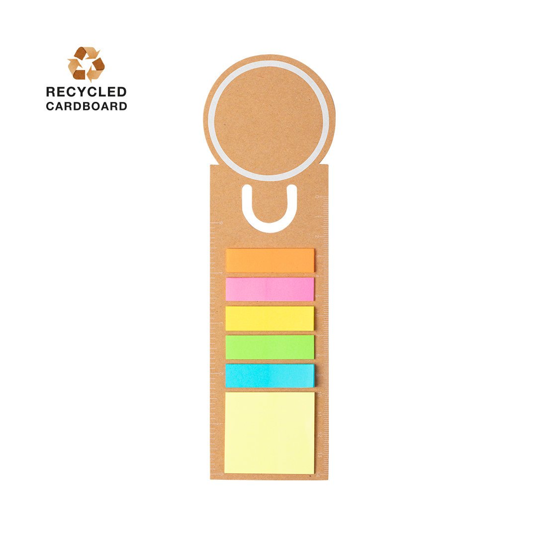 Marque pages/règle. Fabriquée en carton recyclé, avec une large surface d’impression. Comprend 15 notes adhésives de taille moyenne et 75 mini notes adhésives