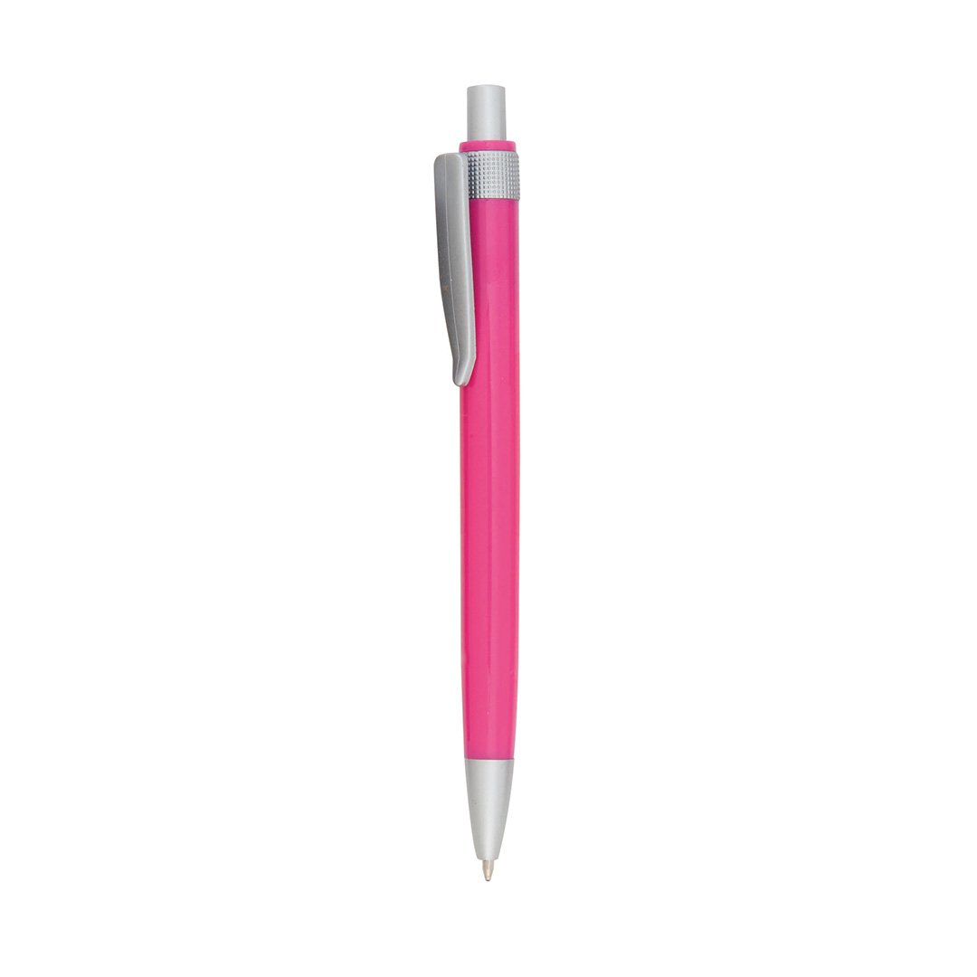 Stylo bicolore à bouton poussoir avec attributs gris argent et corps en couleurs vives. Clip original assorti. Encre bleue.