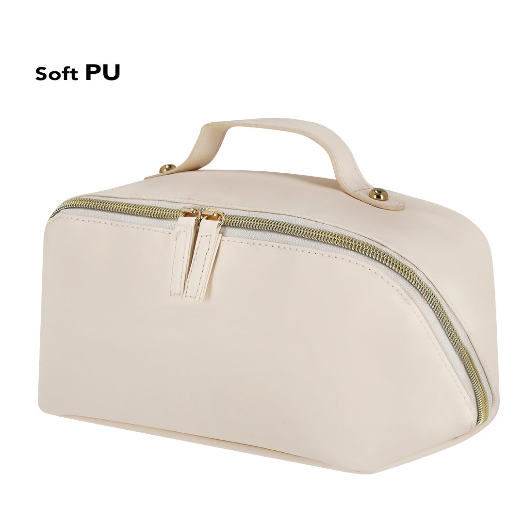 Trousse en PU doux, avec un compartiment principal à large ouverture. Avec des tirettes en PU assorties et une fermeture éclair de couleur dorée. Intérieur avec double compartiment et poche supplémentaire avec fermeture éclair.