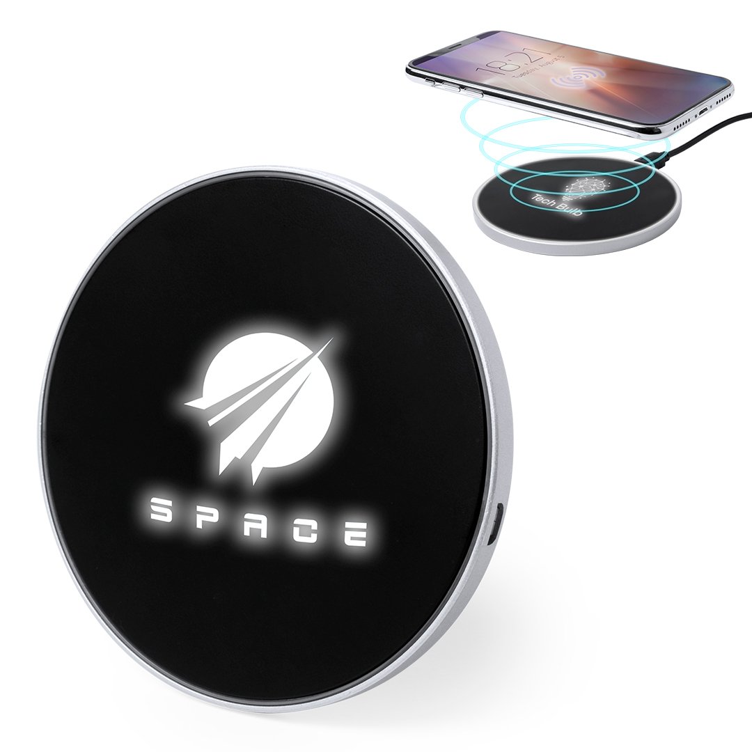 Chargeur sans fil circulaire. En noir élégant, avec la lumière intérieur de LED et un revêtement extérieur spécialement conçu pour le marquage de laser, avec lequel vous obtiendrez votre publicité ou marque illuminée avec la lumière blanche. Base antidérapante compatible avec les appareils équipés d une technologie de recharge sans fil. Présenté dans la boîte attrayante de conception. Câble USB inclus.