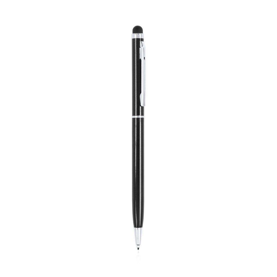 Stylo stylet à mécanisme rotatif, corps ultra-mince en aluminium finition métallisée et embout tactile assorti. Coloris variés. Attributs et bagues coloris argent. Encre bleue.