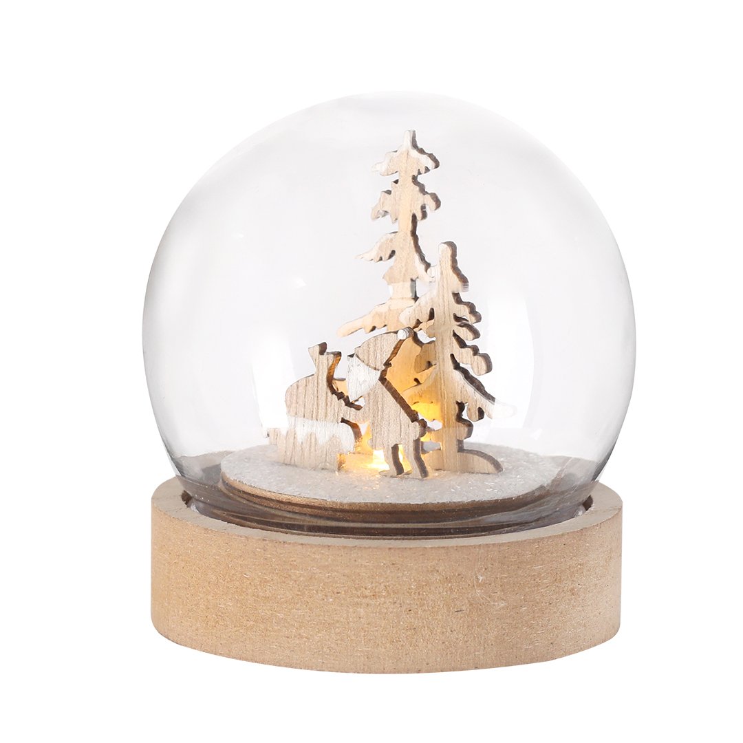 Boule illuminée avec un design de Noël original. Fabriquée en matériau acrylique résistant, avec une base en bois lisse pour l’impression. Alimentée par 3 piles bouton (incluses), avec bouton ON/OFF à la base.Fabriqué avec des éléments à base de plantes pour favoriser l’utilisation de matières premières naturelles et réduire les émissions polluantes.