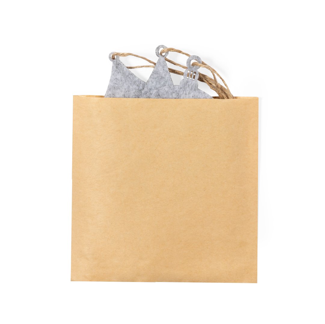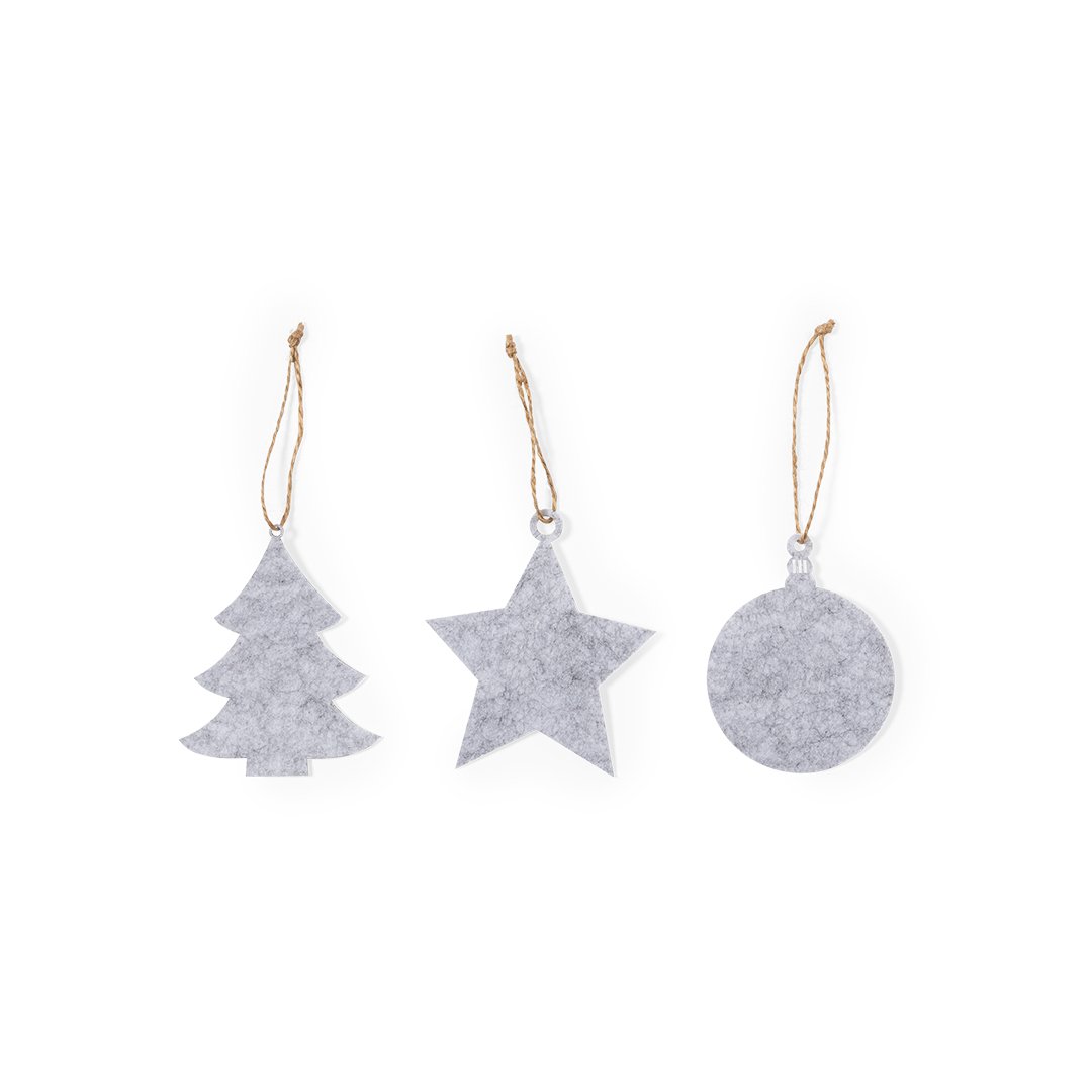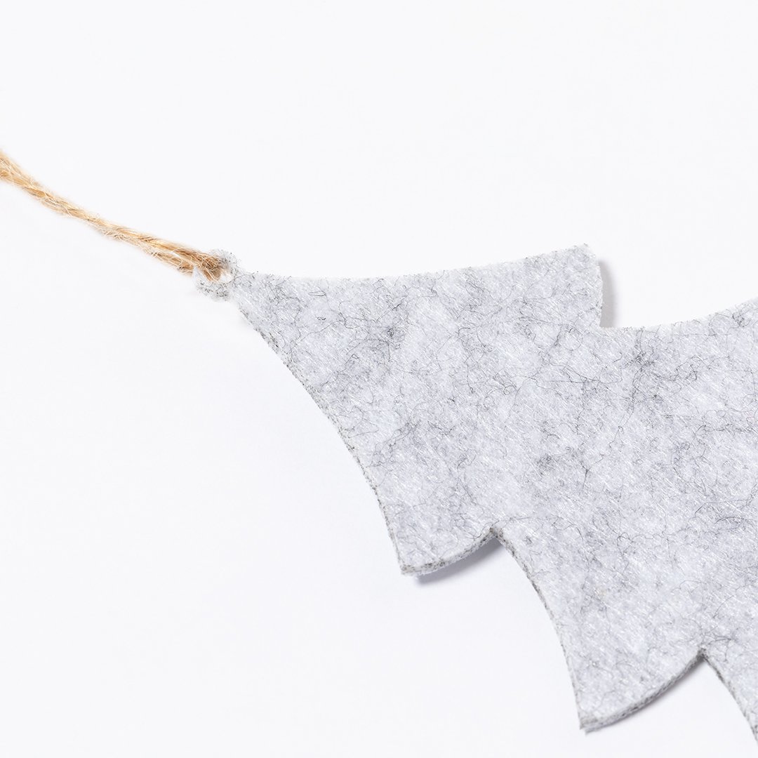 Ensemble de 3 décorations de Noël en feutre doux. Comprend 3 motifs : sapin de Noël, étoile et boule de Noël. Toutes les pièces comprennent un cintre. Présenté dans un sac en papier recyclé.