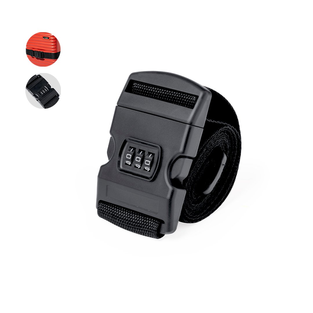 Ruban à valise en polyester résistant. Ceinture de valise pratique avec fermeture par clic et mot de passe à 3 chiffres, finition noire élégante et de longueur 200cm. Présenté dans un sac individuel en papier recyclé.
