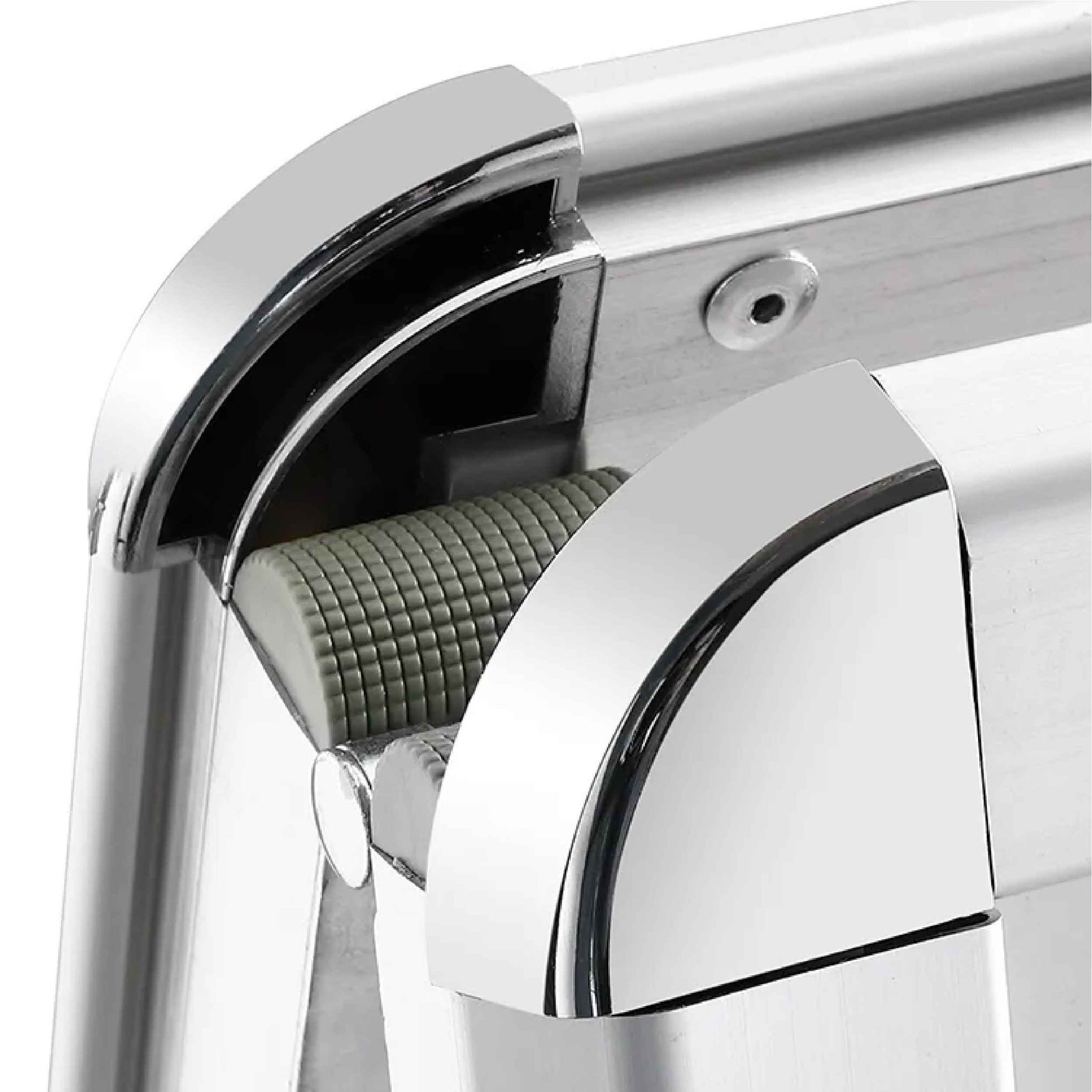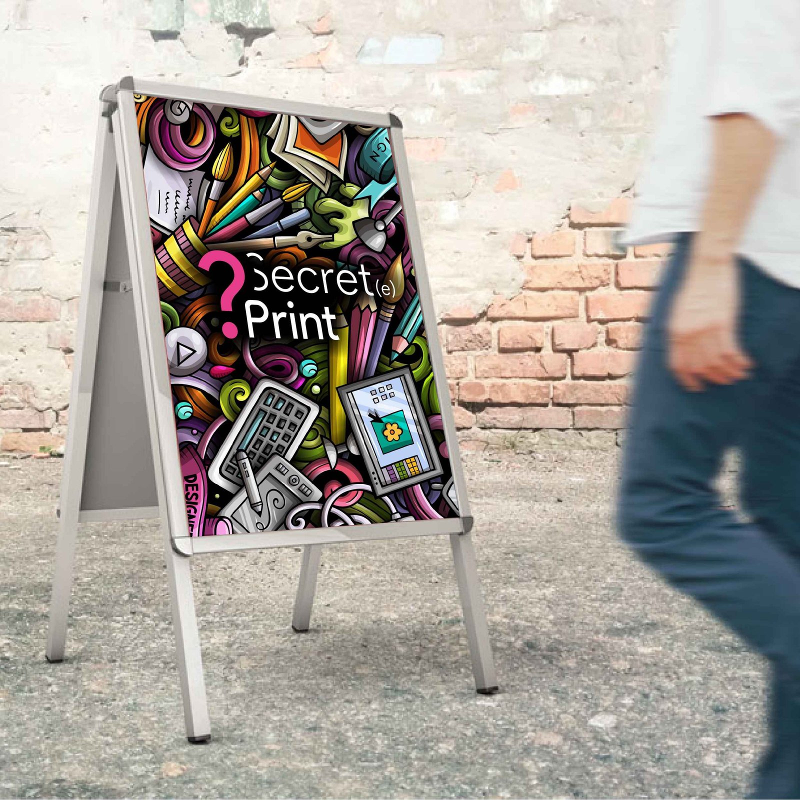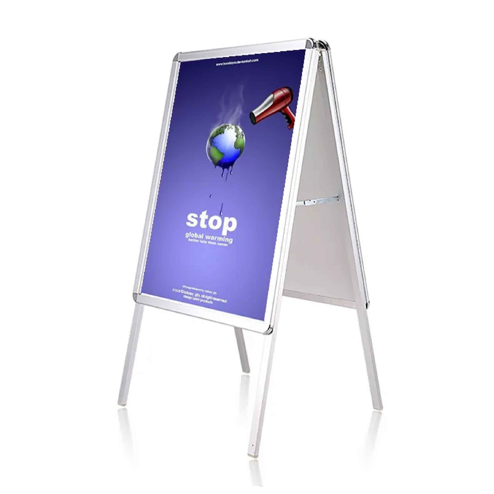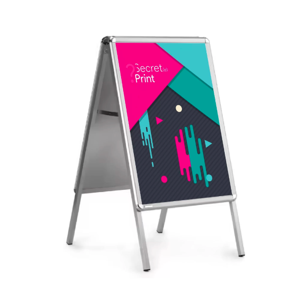 Résistant à l'eau / Des affiches faciles à changer / Pliable / Possibilité de mettre 1 poster de chaque côté pour une double visibilité / Poster non inclus / Moins stable avec le vent