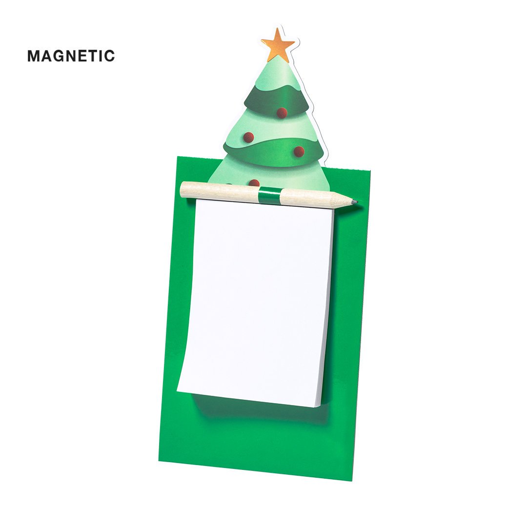Aimant avec un bloc-notes dans un design amusant d’arbre de Noël. Comprend 40 feuilles unies et un crayon en bois naturel.