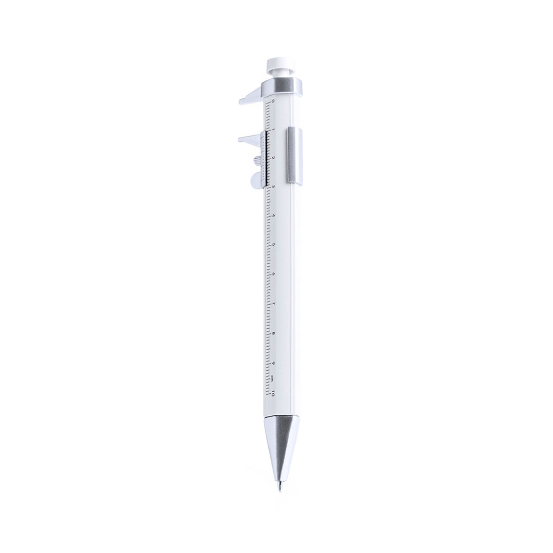 Stylo pied à coulisse à mécanisme pivotant. Avec règle de 10 cm intégrée sur le corps. Encre bleue.