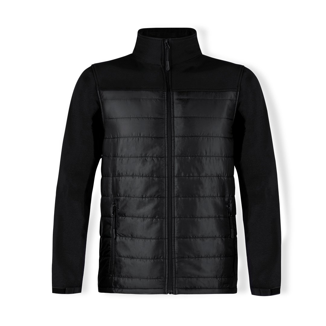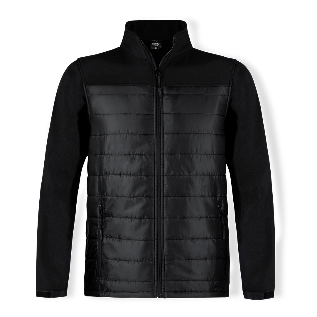 Veste imperméable et respirante en soft shell et polyester. Couleur noire, fermeture éclair pour les poches, ouverture facile. Poignets réglables et disponible en tailles S, M, L, XL, XXL.