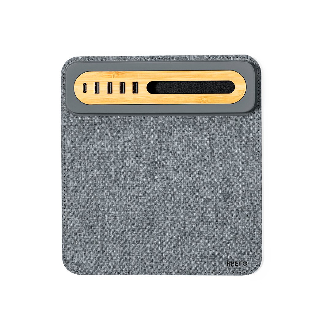 Tapis élégant et fonctionnel composé d’une combinaison de polyester RPET doux et de bambou. Avec un port Type-C et quatre ports USB 2.0, vous permettant de connecter et de charger facilement des appareils. Avec support pour smartphone et base antidérapante qui garantit une utilisation confortable et stable.Entrez dans une nouvelle ère de connectivité et de durabilité sur le lieu de travail.Présenté dans une boîte design kraft individuelle et dans un sac recyclé.Le matériau RPET est fabriqué à partir de plastique recyclé, afin de favoriser la réutilisation des déchets plastiques et d’aider à la durabilité de la planète.