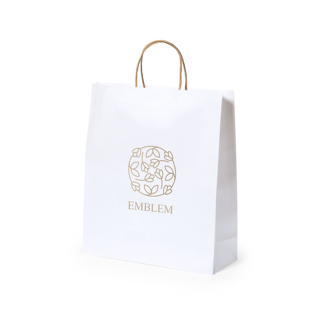 Sac de la ligne Nature, en papier recyclé finition blanc 100g/m2, avec anses courtes renforcées de couleur naturelle et soufflet. Résistance jusqu’à 8 kg de poids.