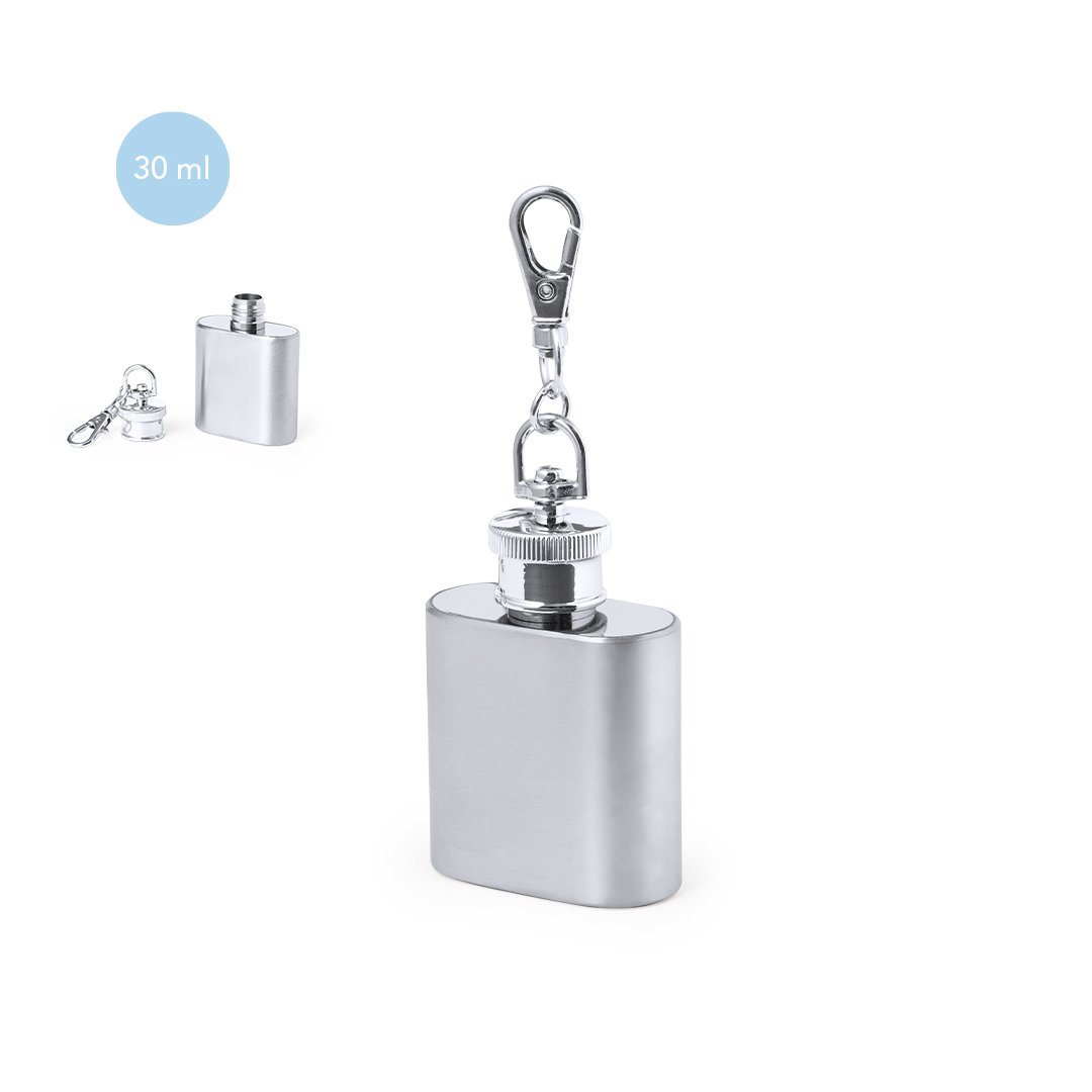 Porte-clés pratique en acier inox de 30 ml. Bouchon avec fermeture de sécurité à vis et mousqueton rotatif. Présenté dans une boîte de conception kraft.