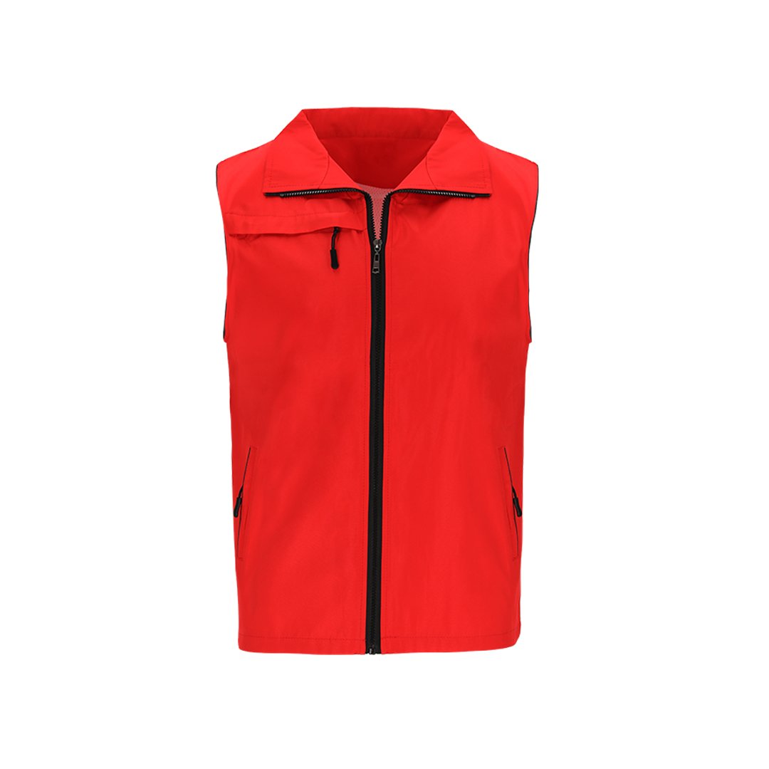 Gilet unisexe en tissu léger et respirant avec doublure en maille blanche. Fermeture à glissière noire sur le devant et tirette argentée. Comprenant une poche extérieure sur la poitrine droite et deux poches latérales avec des zips et des tirettes noirs. Avec un demi-lune à l’intérieur du col.