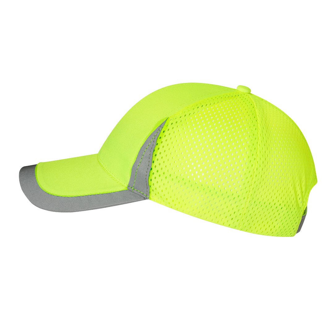Casquette de sport en polyester doux. Fermeture réglable avec velcro et dos avec filet respirant. Couleur jaune fluor avec détails réfléchissants sur la visière, l’avant et la fermeture.