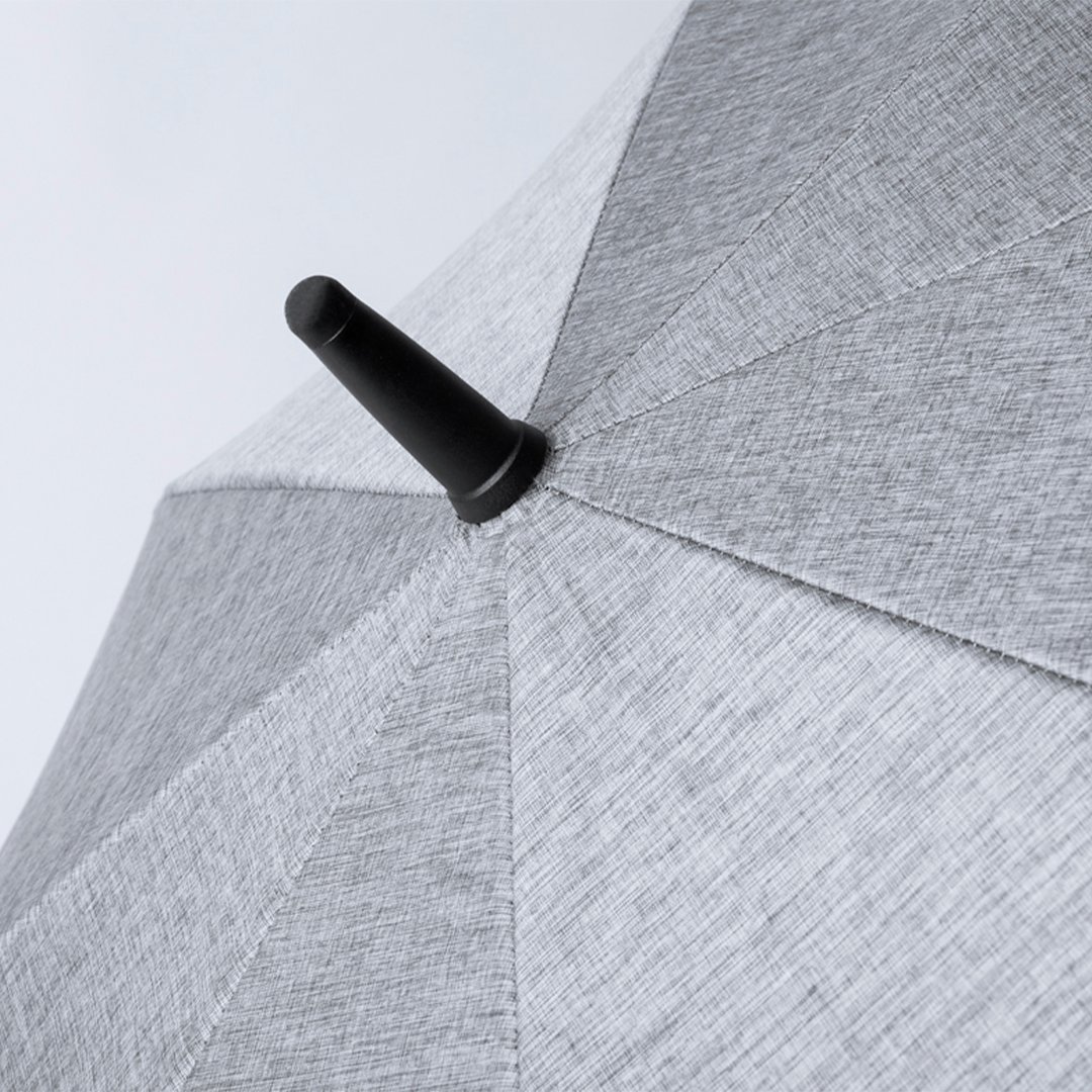 Parapluie de haute qualité de 130cm de diamètre, fabriqué en polyester 150D et dans une élégante teinte grise marbrée. Ouverture automatique et tiges de fibre de verre, avec système coupe-vent et fermeture velcro. Avec poignée ergonomique en ABS souple et présenté dans un sac recyclé.