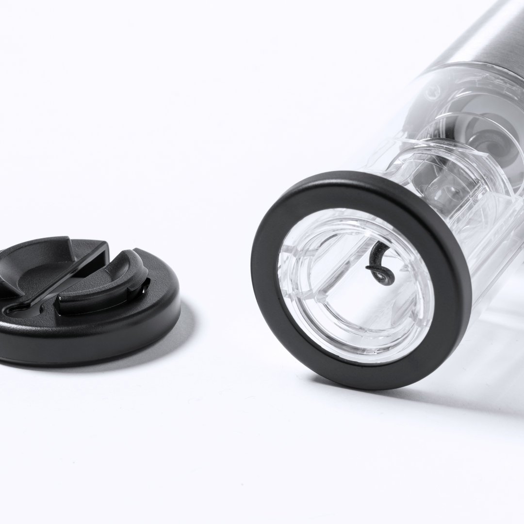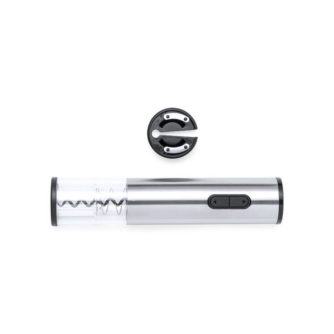 Tire-bouchon électrique en acier inoxydable et ABS résistant, avec coupe capsule inclus. Présenté dans une boîte individuelle design, avec un manuel d’instructions en espagnol et en anglais. Fonctionne sur piles (4xAA non incluses).