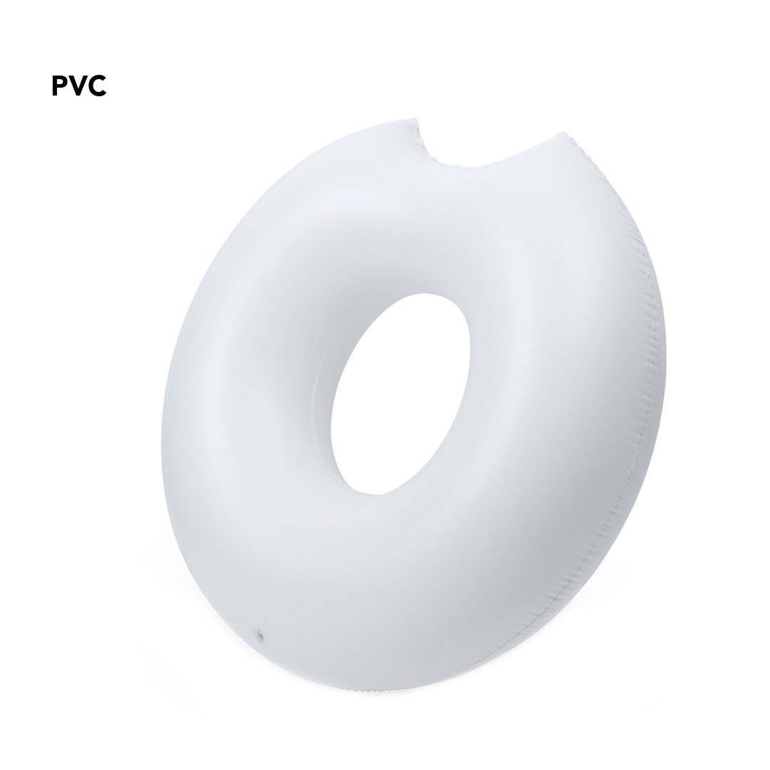 Matelas gonflable original en PVC de grande taille et en forme de beignet Donut mordu. Présenté avec pliage spécial pour faciliter l´impression.