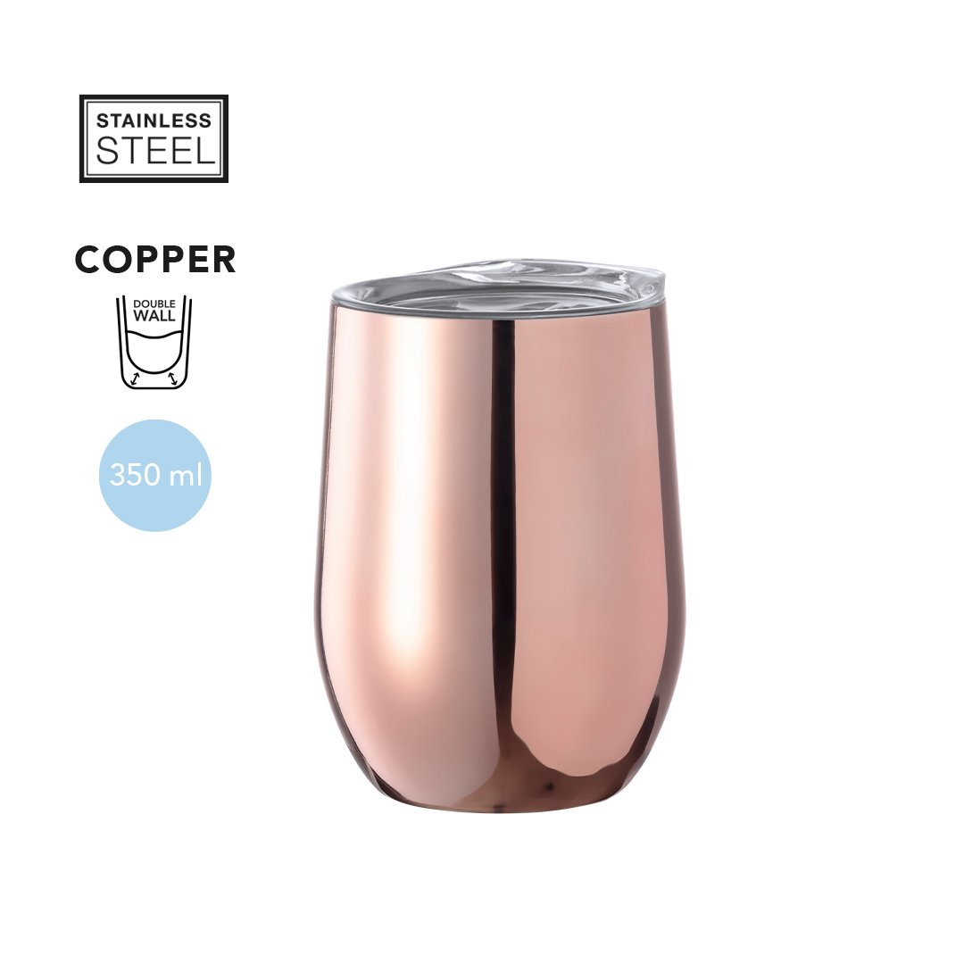 Verre thermique en acier inox à double paroi et 350ml de capacité, avec revêtement extérieur en cuivre galvanisé. Doseur sur bouchon et sans BPA. Il est idéal pour votre bureau, table ou toute autre surface où vous pouvez tranquillement savourer votre boisson préférée.