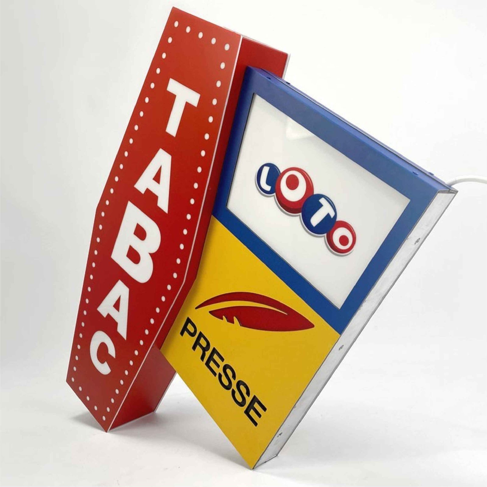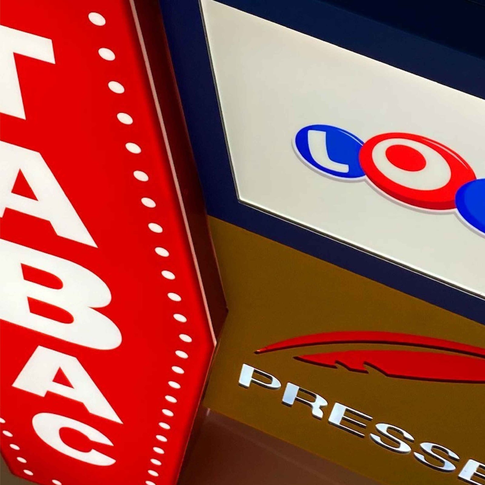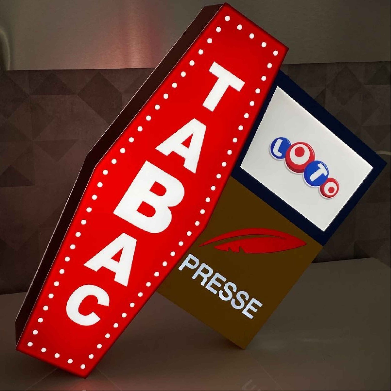 L’enseigne Tabac LOTO + Presse de SecretPrint est spécialement conçue pour les buralistes, signalant clairement la disponibilité de produits tabac, loto, presse, vape, FDJ ou PMU. Son éclairage attire l’attention aussi bien pendant les soirées d’hiver que les nuits d’été, ce qui en fait un atout idéal pour mettre en valeur votre entreprise et attirer davantage de clients.Double éclairage pour une meilleure visibilité / Personnalisation des dimensions / Design attractif et identifiable / Installation facile / Matériaux durables et résistants / Couleurs durables et longue durée de vie / Garantie de 3 ans / Personnalisation limitée