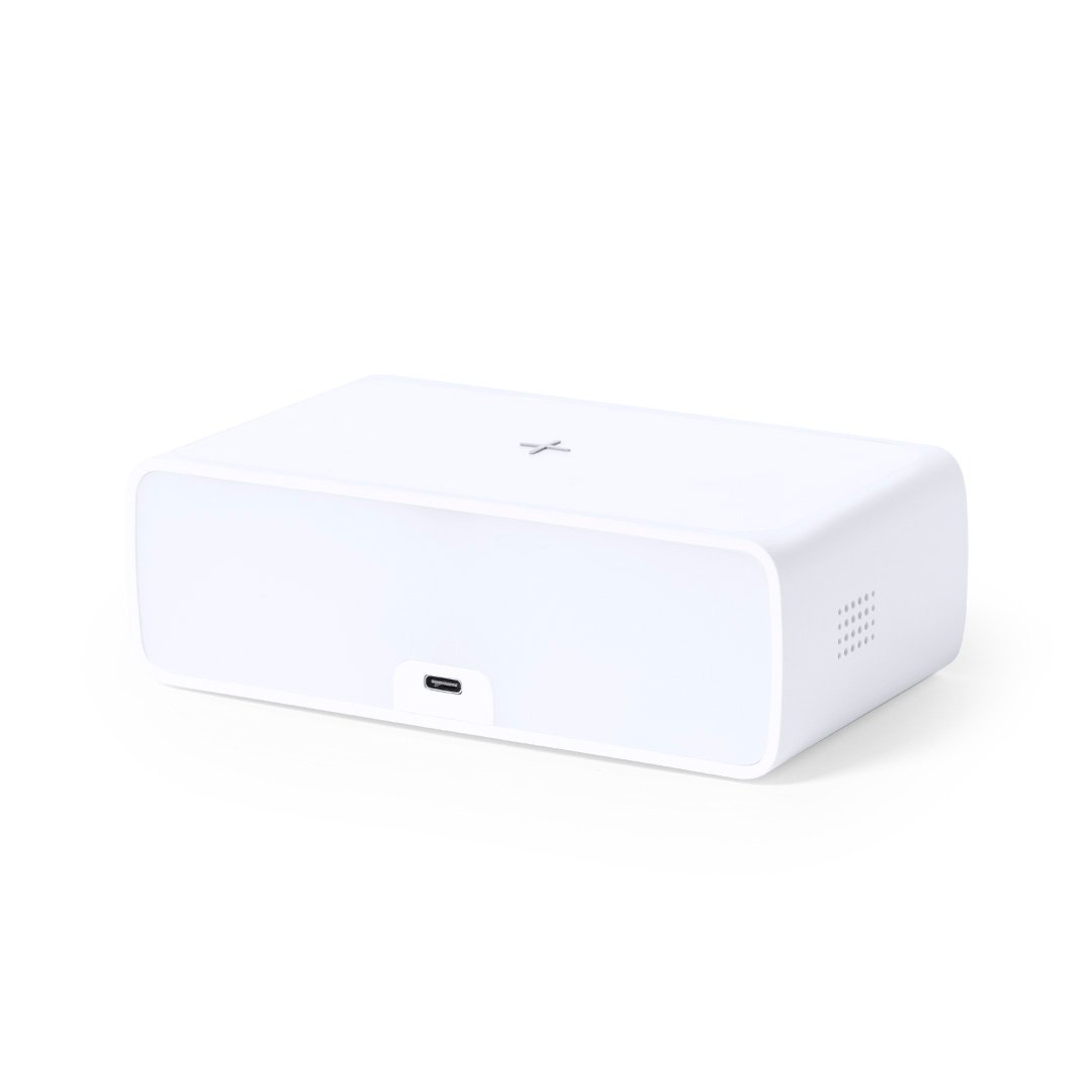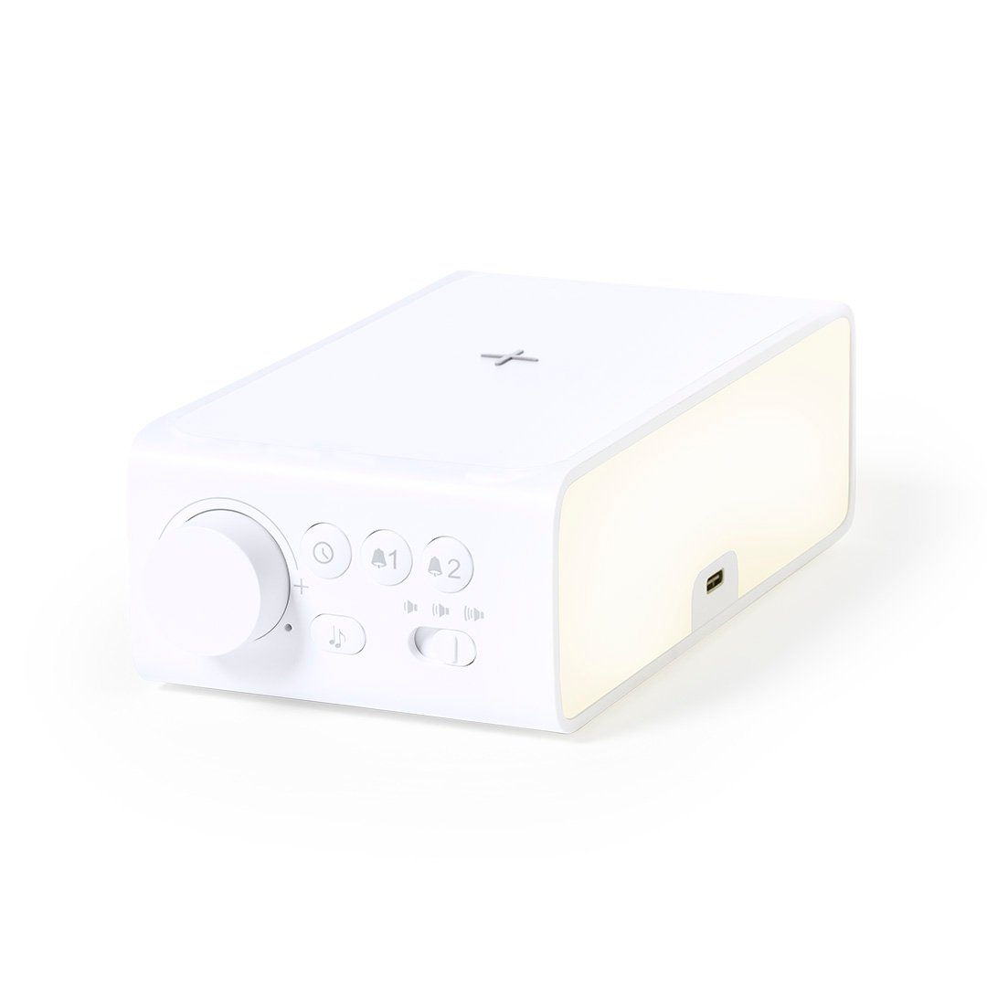 Montre multifonction au design élégant de couleur blanche avec chargeur sans fil 10W intégré et lampe LED intégrée. Avec fonction date / heure, alarme et lampe 36 LED avec intensité lumineuse dimmable. Connexion USB, avec câble Type-C de 100 cm inclus et alimentation auxiliaire aux piles bouton (incluses). Compatible avec les appareils équipés de la technologie de charge sans fil. Présenté dans une boîte de design attrayante. Conformément aux exigences de sécurité :Système de protection contre la surchauffe.Système de protection contre les surcharges.