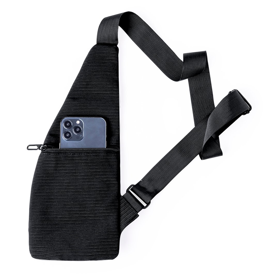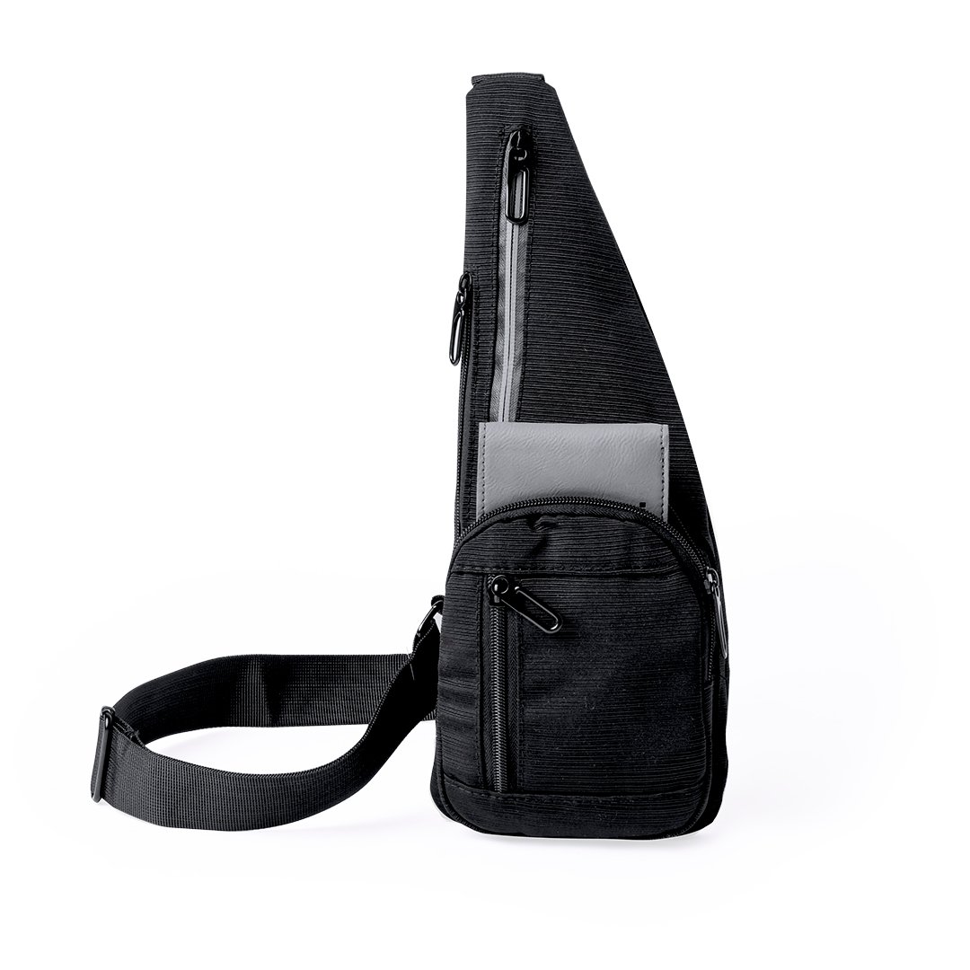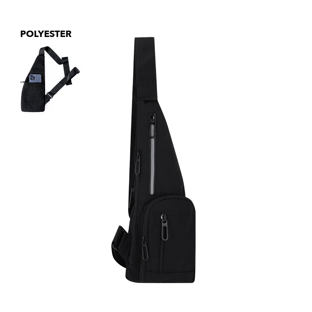Bandoulière en polyester 300D, offre plusieurs poches pour une organisation efficace. Deux poches principales sont situées à l’avant et une sur le côté, avec deux poches supplémentaires à l’avant et à l’arrière. Elle se distingue par une bande réfléchissante dans la poche centrale pour améliorer la visibilité. Elle est présentée individuellement dans un sac recyclé.