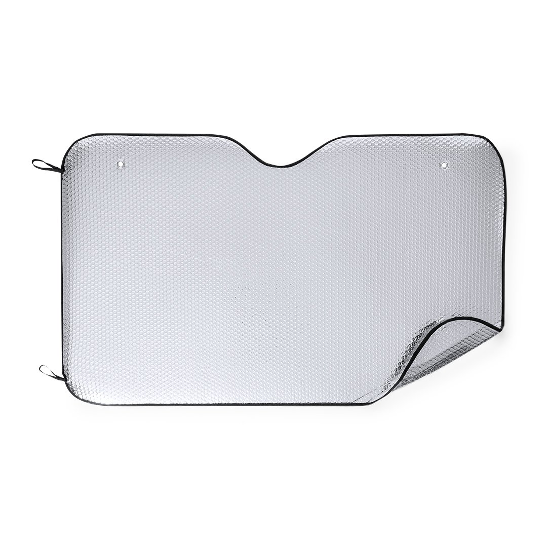 Pare-soleil en aluminium avec bulles sur les deux côtés en coloris argent métallisé et liseré noir. Dimensions 130 x 80cm, avec anneaux de renfort en métal, sangles élastiques pour le pliage et deux ventouses pour la fixation. Livré à plat pour faciliter l´impression.