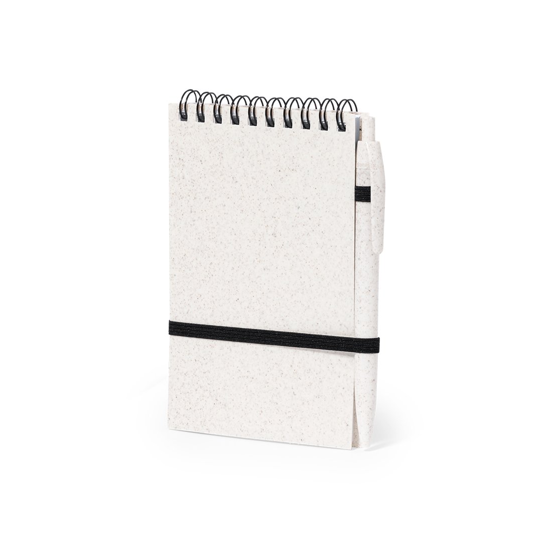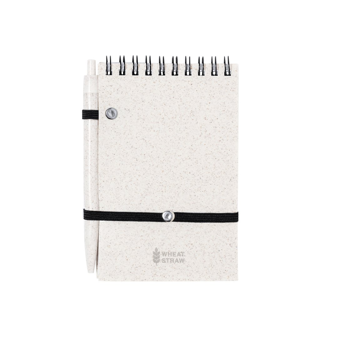 Cahier à anneaux avec couvertures en canne de blé et stylo assorti, également en canne de blé. De taille compacte, avec fermeture élastique en noir élégant. Comprend 70 feuilles avec une disposition en ligne et une conception écologique. Stylo à bille à bouton-poussoir en roseau de blé avec encre bleue. Comprend un badge de paille de blé. Présenté dans un sac recyclé individuel.Fabriqué avec des éléments végétaux pour favoriser l’utilisation de matières premières naturelles et réduire les émissions polluantes.