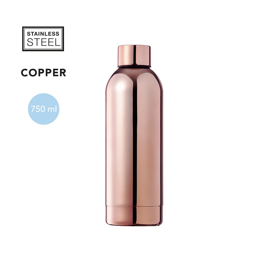 Bouteille d’une capacité de 750 ml, fabriquée en acier inoxydable avec un revêtement extérieur en cuivre galvanisé. Bouchon à vis, sans BPA. Présenté dans une boîte noire individuelle au design élégant.