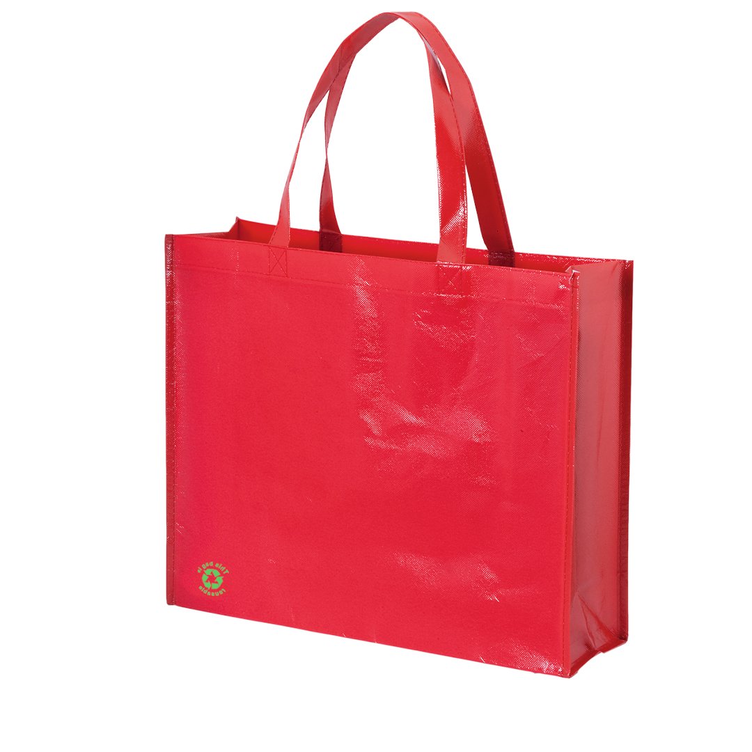 Sac en Intissé laminé de finition brillante.Gamme variée de couleurs vives. Avec anses renforcées de dimension moyenne 48 cm. Finition cousue. Soufflet et liseré renforcé