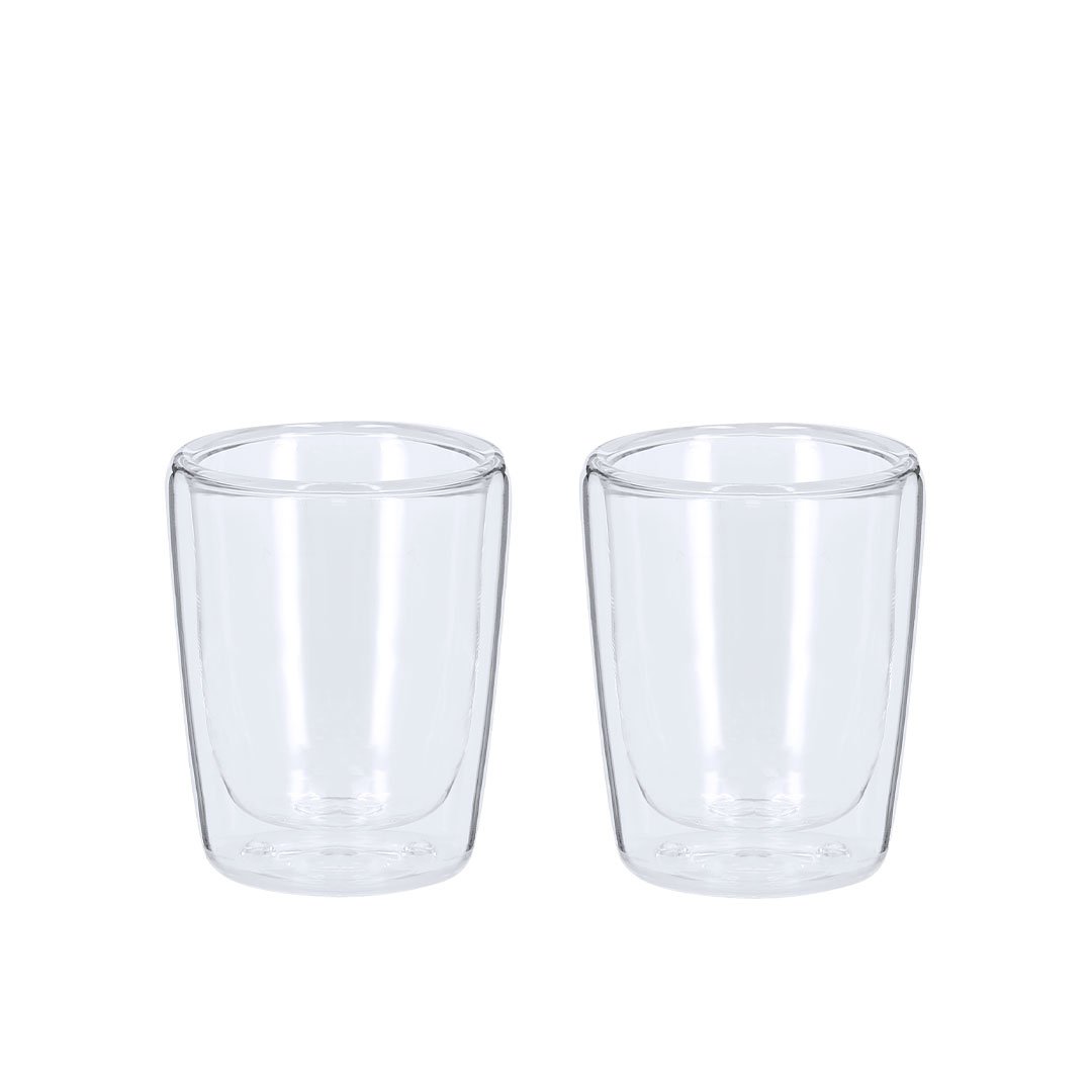 Élégant set de verres en verre borosilicaté à double paroi. Inclut deux verres, chacun avec une capacité de 65 ml. Présenté dans une boîte découpée.