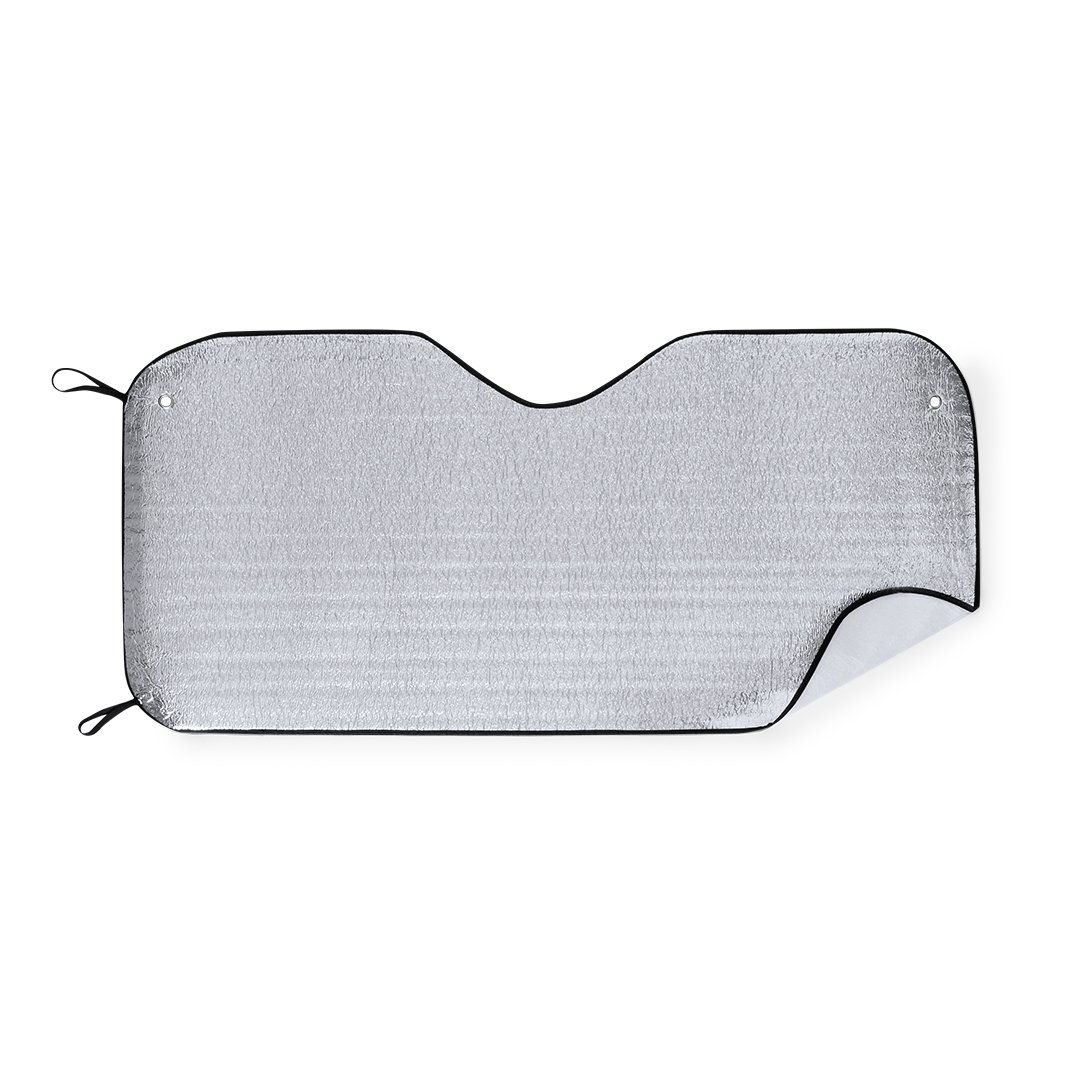 Pare-soleil avec face avant en aluminium et face arrière en mousse. Dimensions 130 x 60 cm, avec bordures en non-tissé et élastiques noirs pour le pliage. Comprend 2 anneaux métalliques et deux ventouses pour ajustement sur le pare-brise. Présentation dépliée en plaque pour impression facile.