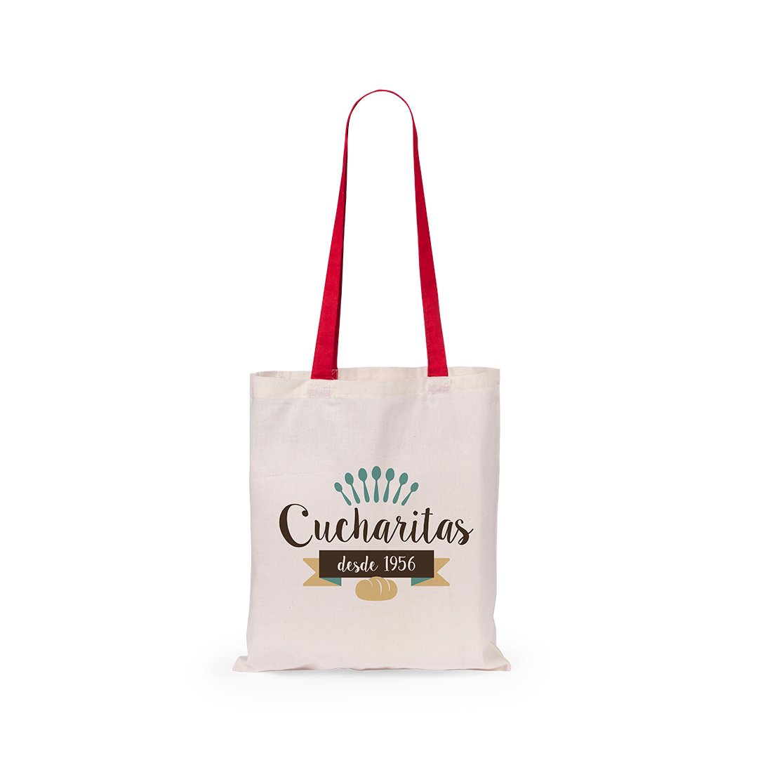 Sac en coton. Corps de couleur naturelle et poignées en couleurs vives et variées. Anses de 70 cm de long, finition cousue. Résistance au poids jusqu´à 7 kg.