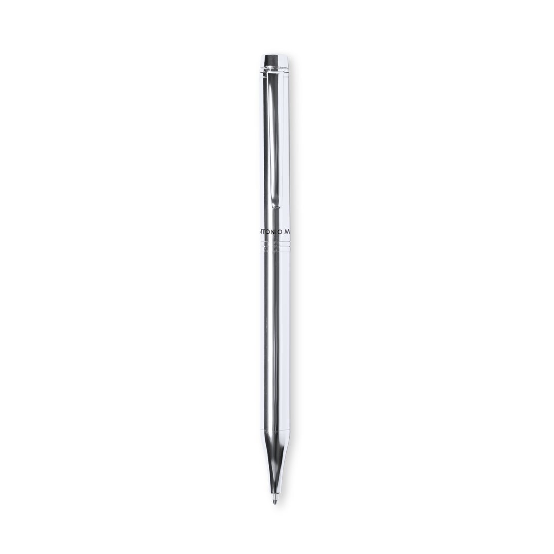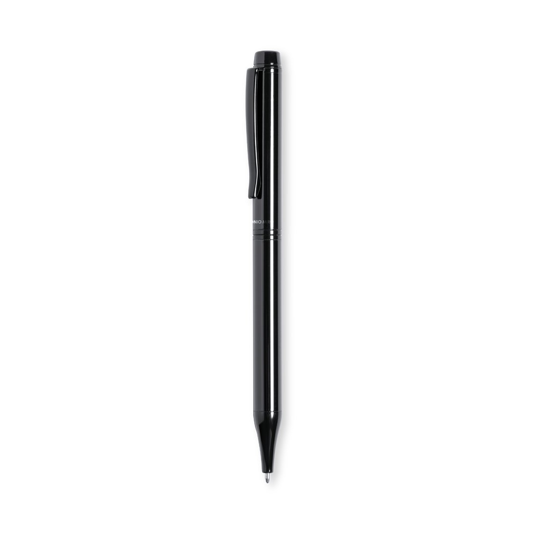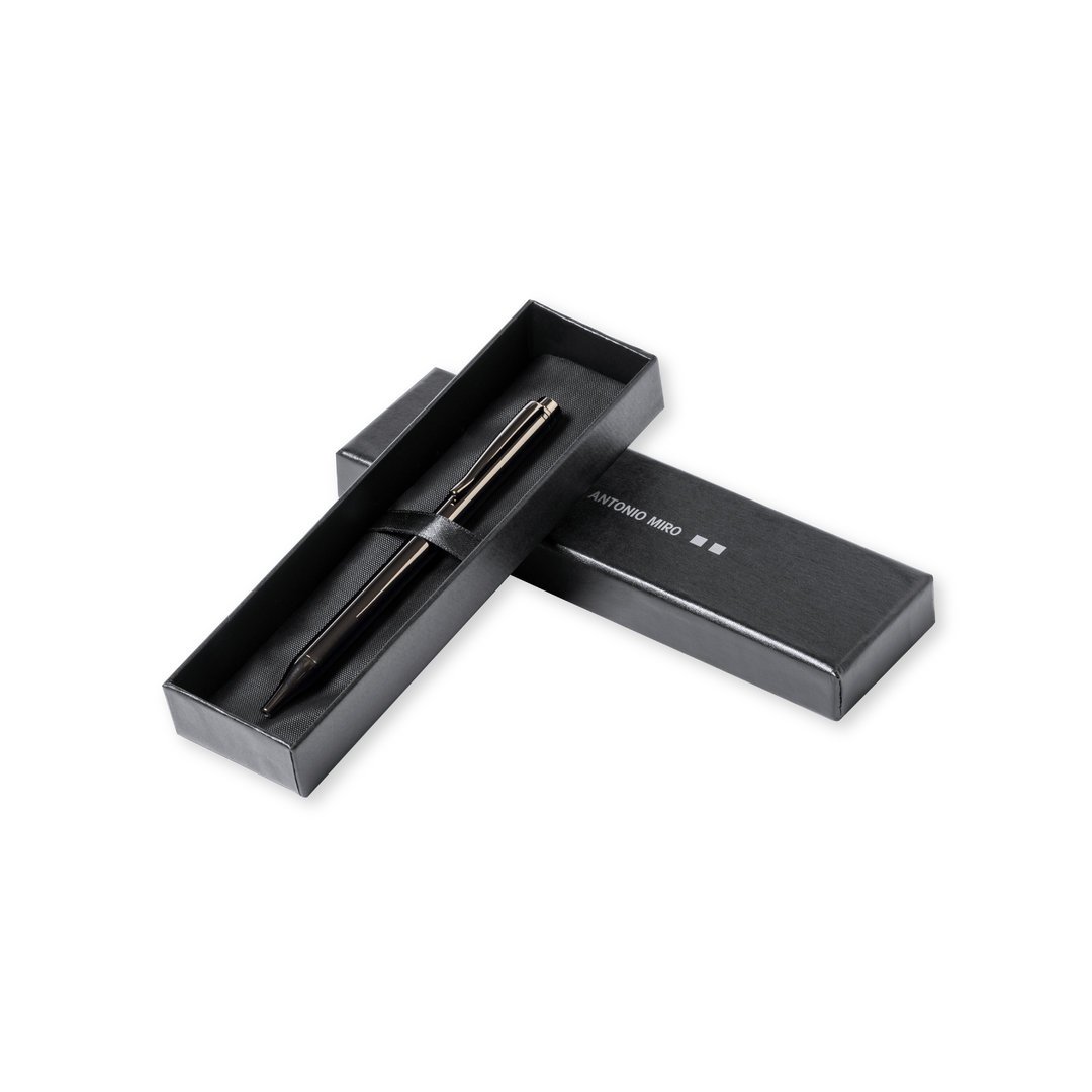 Stylo à bille Antonio Miró en métal avec finition brillante, avec le logo de la marque sur le corps et disponible dans une large gamme de couleurs. Avec mécanisme rotatif et à l’encre bleue. Présenté dans une boîte noire individuelle élégante et résistante avec le logo Antonio Miró et une couverture assortie.