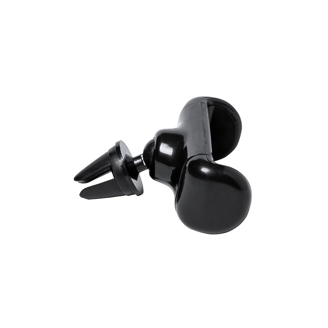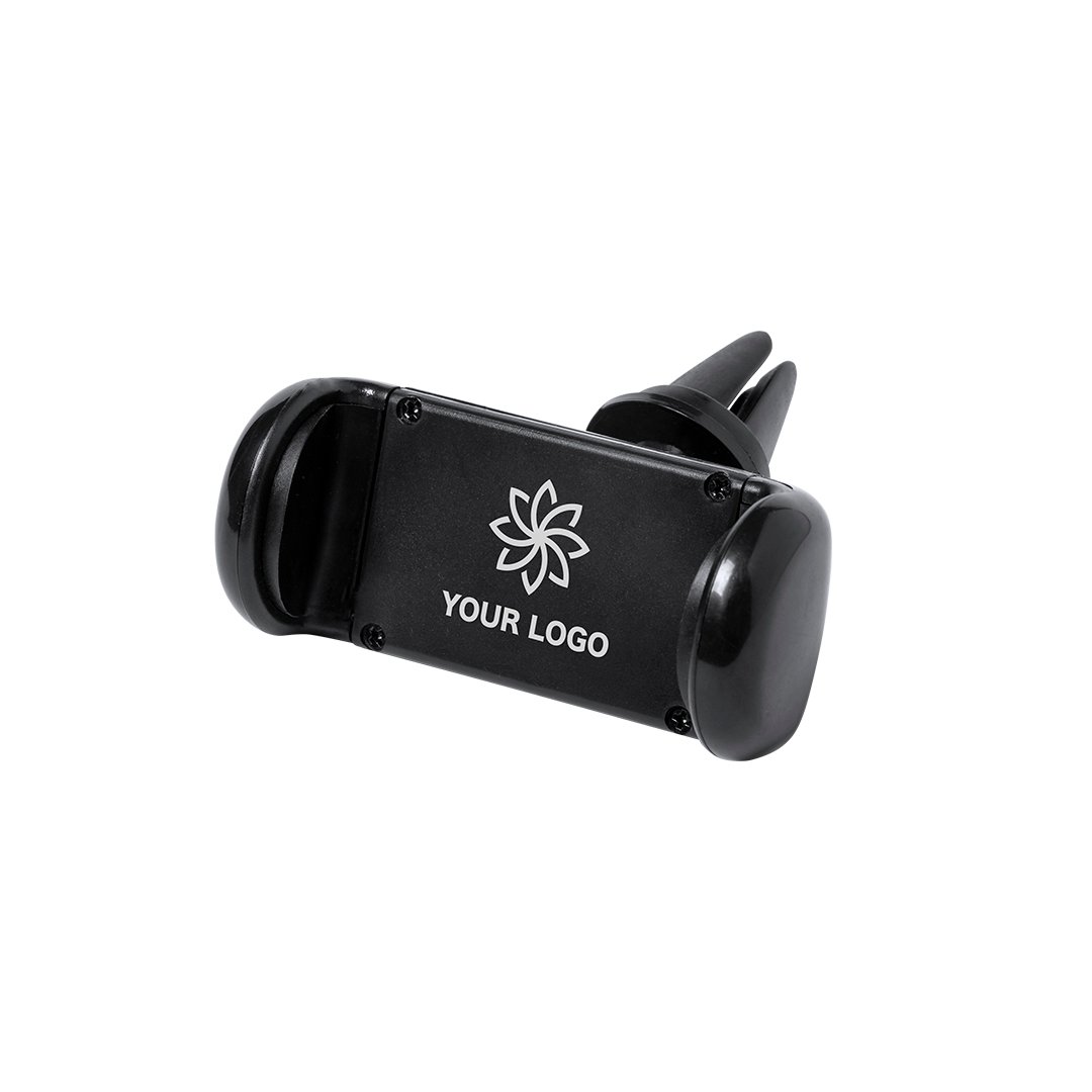 Support réglable pour smartphone au design minimaliste, avec base rotative 360 degrés et finition noire élégante. Avec système de fixation pour calandre de ventilation de voiture et grande surface de marquage, spécialement conçu pour le marquage en tampographie,