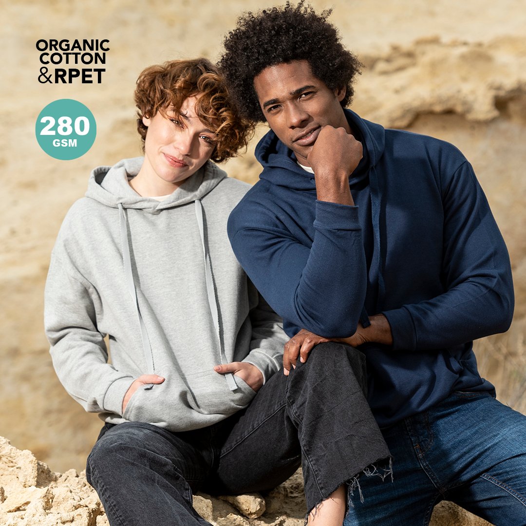 Sweat à capuche unisexe pour adulte. Fabriqué en combinaison de coton peigné biologique et de polyester RPET de 280gsm. Poche kangourou et capuche doublées de tricot lisse, avec des lacets assortis. Cou, poignets et taille tricotée côtelée 2×1, épaules avec couture.