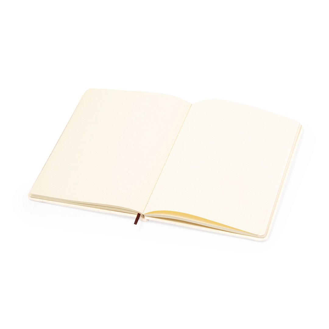 Bloc-notes fabriqué en lin souple. Couvertures rigides, marque-page, bande élastique marron et 80 feuilles lisses de couleur naturelle. Avec le logo Lino en contre-couverture. Présenté dans un sac individuel. Élaboré à partir d’éléments végétaux pour encourager l’utilisation de matières premières naturelles et réduire les émissions polluantes.