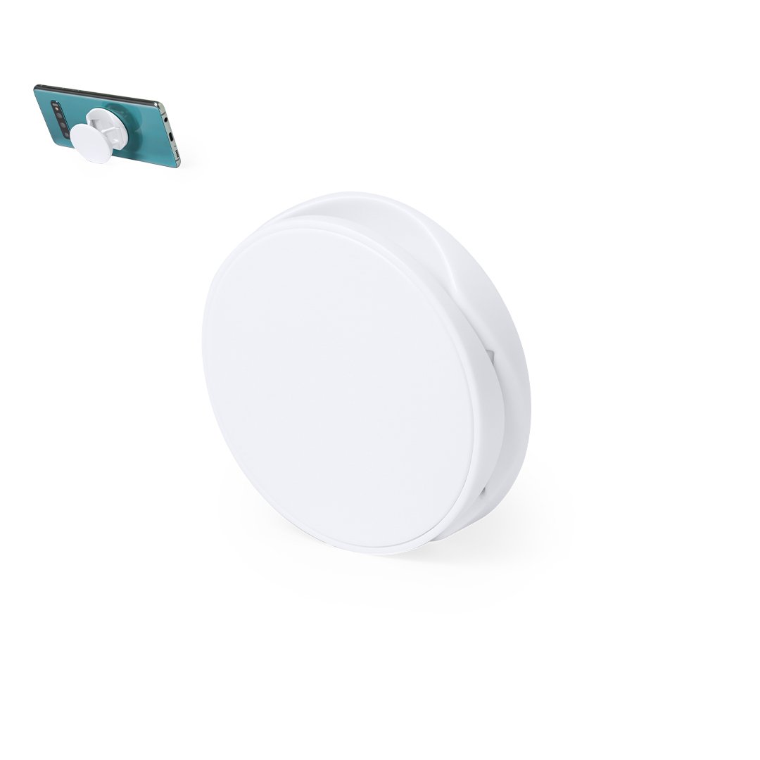 Support de smartphone pliable, finition blanche, spécialement conçu pour la tampographie. Avec adhésif 3M, fixation très résistante et sans résidus lorsqu’il est détaché de l’appareil.