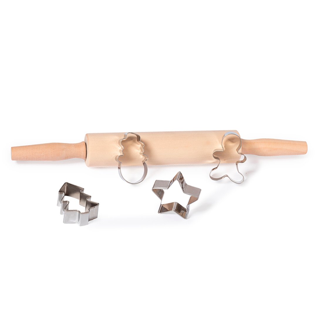 Set de pâtisserie avec moules de Noël en acier inoxydable et rouleau à pâtisserie en bois naturel résistant. Comprend un rouleau à pâtisserie et 4 moules en forme d’arbre de Noël, d’étoile, de bonhomme de neige et de bonhomme en pain d’épice.Présenté dans une boîte kraft.