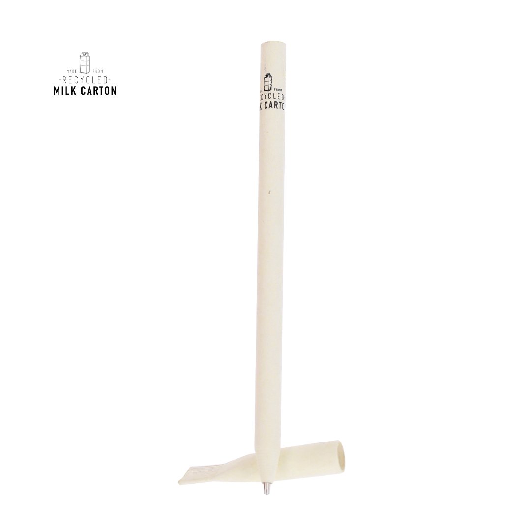 Stylo avec un corps fabriqué à partir de cartons de lait recyclés et des détails en couleur blanche. Avec une fermeture à capuchon et de l’encre bleue, avec un marquage de carton de lait recyclé sur le corps.Les cartons de lait se composent principalement de carton et d’aluminium. Au cours de leur processus de recyclage, les différents matériaux de l’emballage sont séparés pour leur réutilisation et nouvel usage, contribuant ainsi à emprunter le chemin infini de l’économie circulaire. Ce matériau se caractérise par son haut degré de recyclabilité, ainsi que par sa légèreté et sa résistance.
